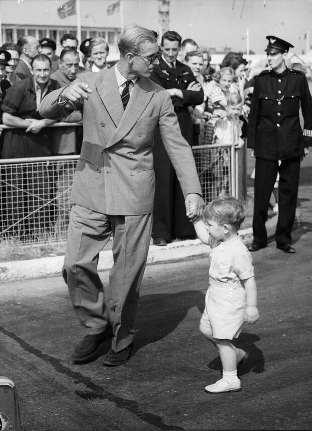 Принц Филипп держит принца Чарльза за руку по прибытии в лондонский аэропорт с Мальты, 27 июля 1951 года.
