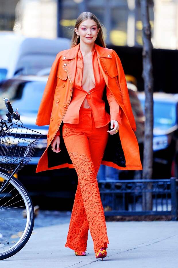 Сочный и не по-зимнему яркий образ Джиджи Хадид на время превратил Большой яблоко в Заводной апельсин. Модель отправилась на прогулку по Нью-Йорку в ансамбле из брюк с кружевной отделкой и рубашки, провокационно надетой на голое тело и застегнутой всего на одну хрупкую пуговицу — авторства нидерландского дизайнера Рональда ван дер Кемпа.