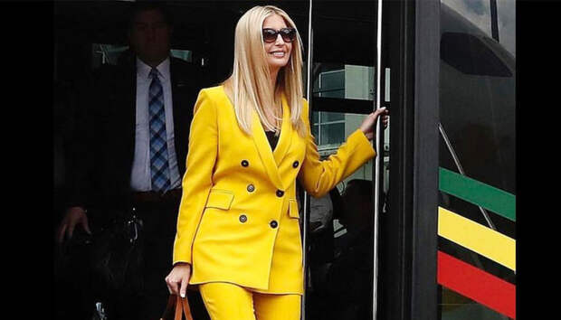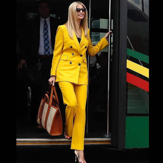 К примеру, несколько часов назад дочь Дональда Трампа покинула жаркую Эфиопию в ярко-желтом брючном костюме от Zara. Мало того, что двойка в солнечной палитре смотрится намного дороже своей реальной стоимости, так Иванке еще и удалось подобрать к эффектному костюму идеальные аксессуары: плетеную сумку Vince Camuto из рыжей кожи и лодочки с пестрым принтом.