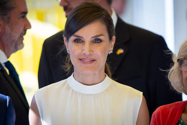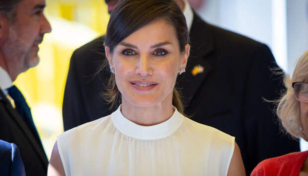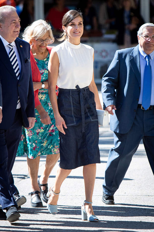Вчера в Мадриде стартовала самая большая книжная ярмарка Испании. На торжественное открытие прибыла королева Летиция. Для выхода в свет супруга Филиппа VI выбрала простой и элегантный образ: белую блузу без рукавов Carolina Herrera, юбку из денима с декоративной обстрочкой, голубые босоножки Mini and Rose и клатч Furla.