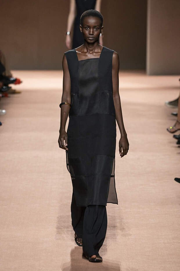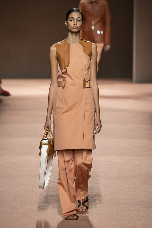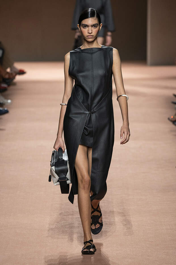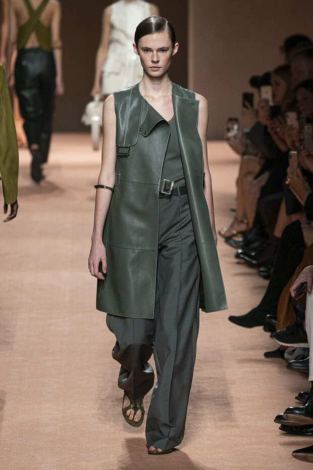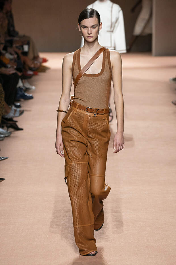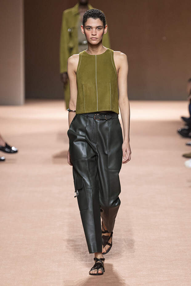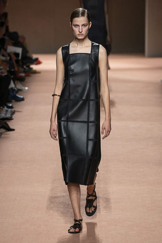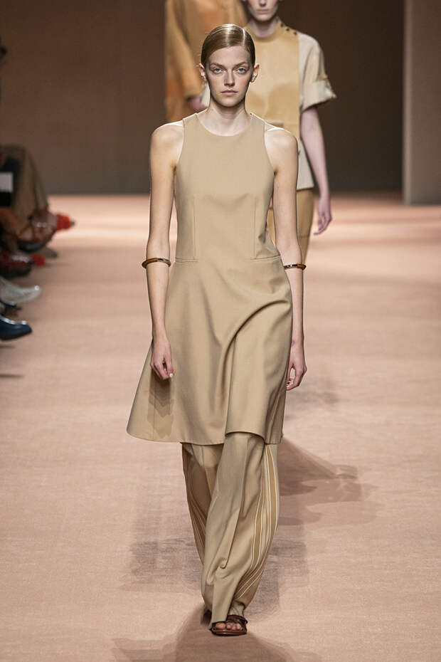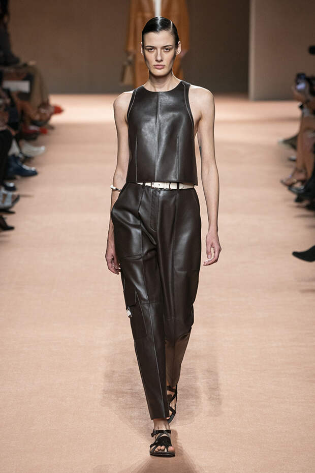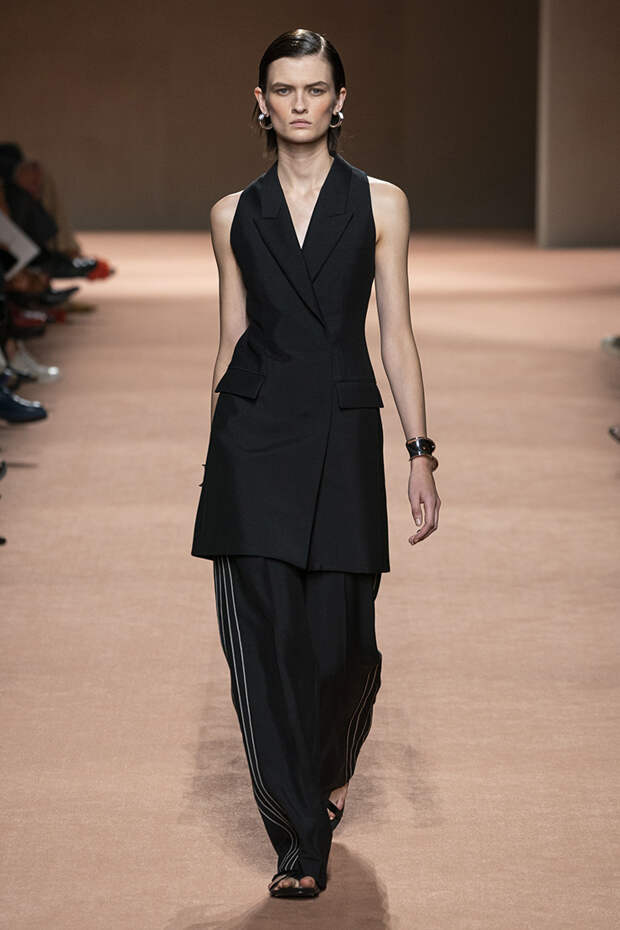 В новой коллекции все точно так же: взяв только пустынные тона и черный, Ване-Цыбульски показала минималистичные, совсем как в 90-х, вещи, в которых, с какой стороны ни посмотри, нет ничего лишнего. Отправной точкой для нее на этот раз стали фартуки, которые носили сотрудники первых мануфактур Hermès. Так что туники, надетые поверх брюк, или топы с перекрещенными лентами — отсылка именно к этому предмету рабочих гардеробов. Впрочем, и без фартуков на подиуме все было в порядке: кожаные платья, брюки и лихие плащи вновь удались.