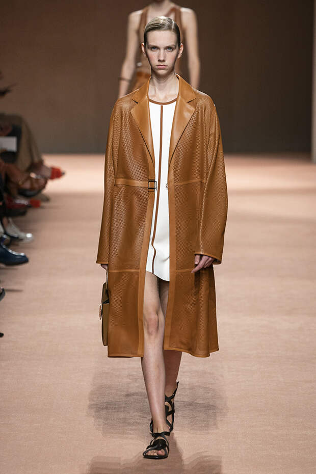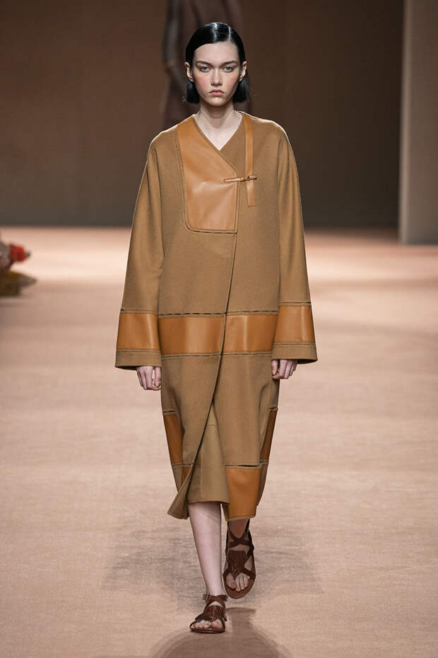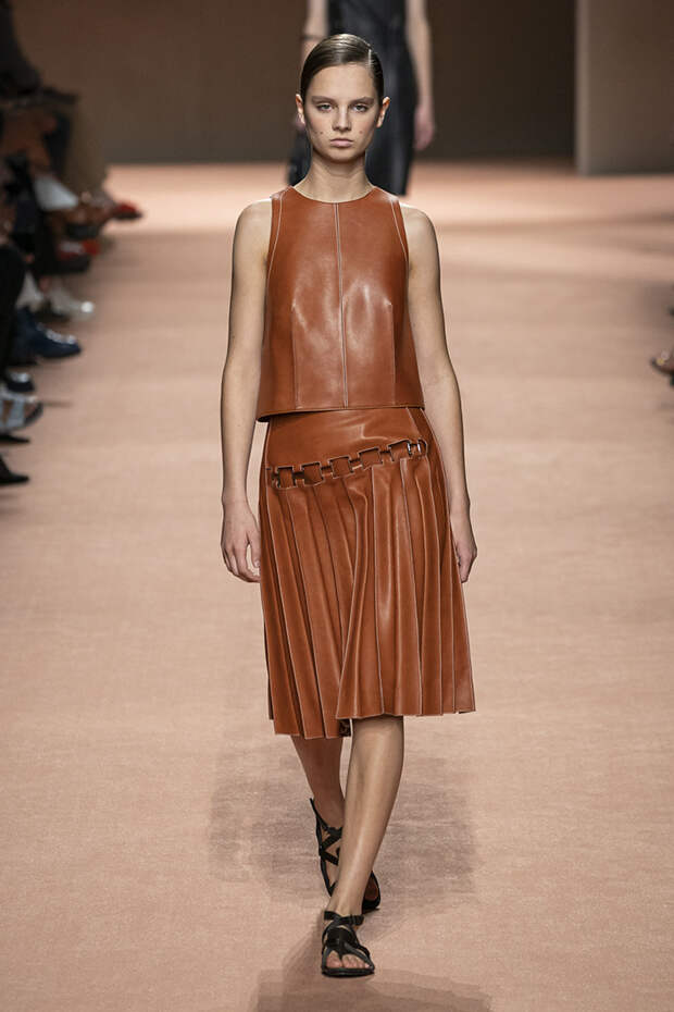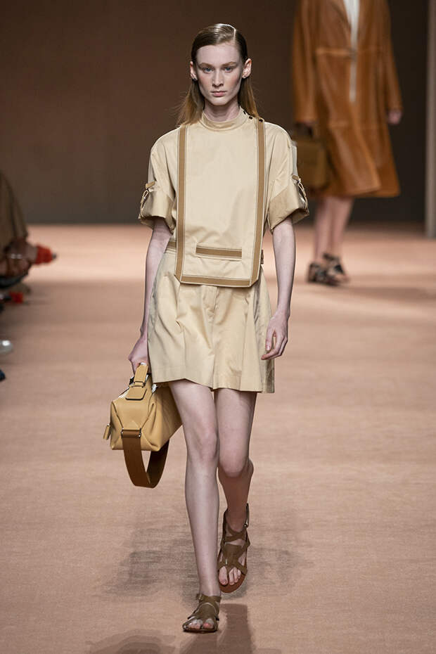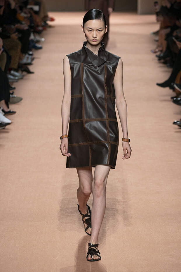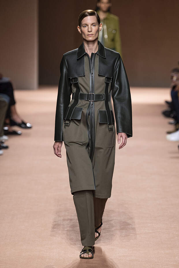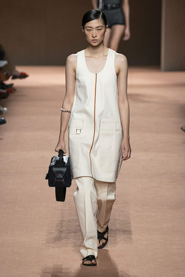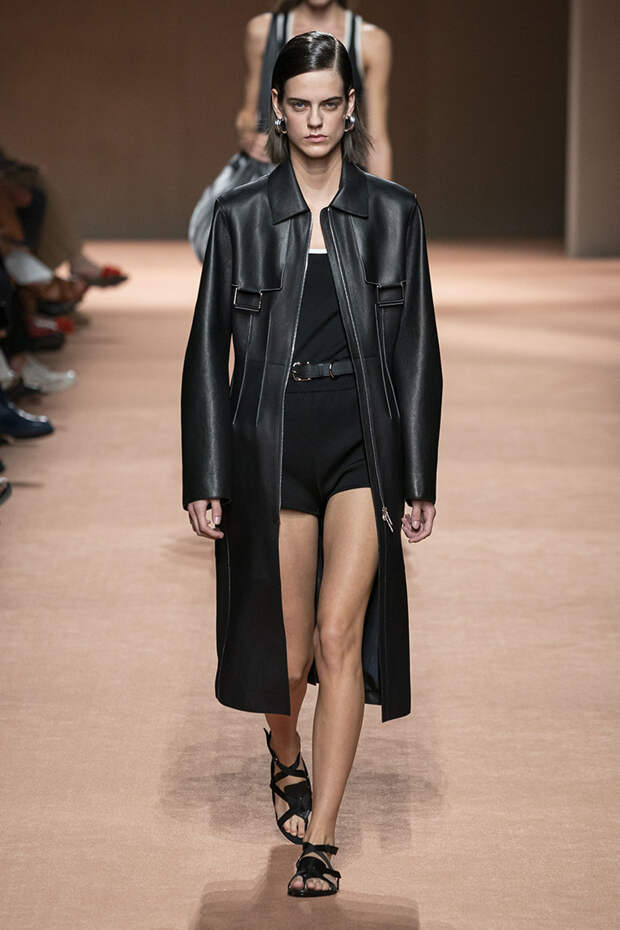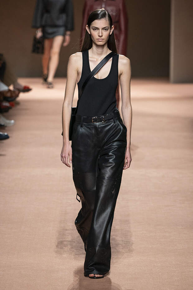 В новой коллекции все точно так же: взяв только пустынные тона и черный, Ване-Цыбульски показала минималистичные, совсем как в 90-х, вещи, в которых, с какой стороны ни посмотри, нет ничего лишнего. Отправной точкой для нее на этот раз стали фартуки, которые носили сотрудники первых мануфактур Hermès. Так что туники, надетые поверх брюк, или топы с перекрещенными лентами — отсылка именно к этому предмету рабочих гардеробов. Впрочем, и без фартуков на подиуме все было в порядке: кожаные платья, брюки и лихие плащи вновь удались.