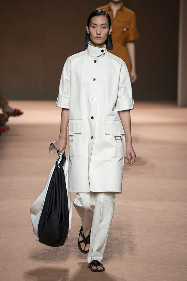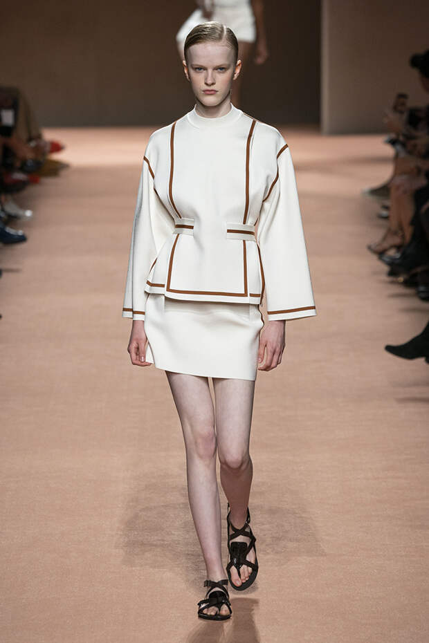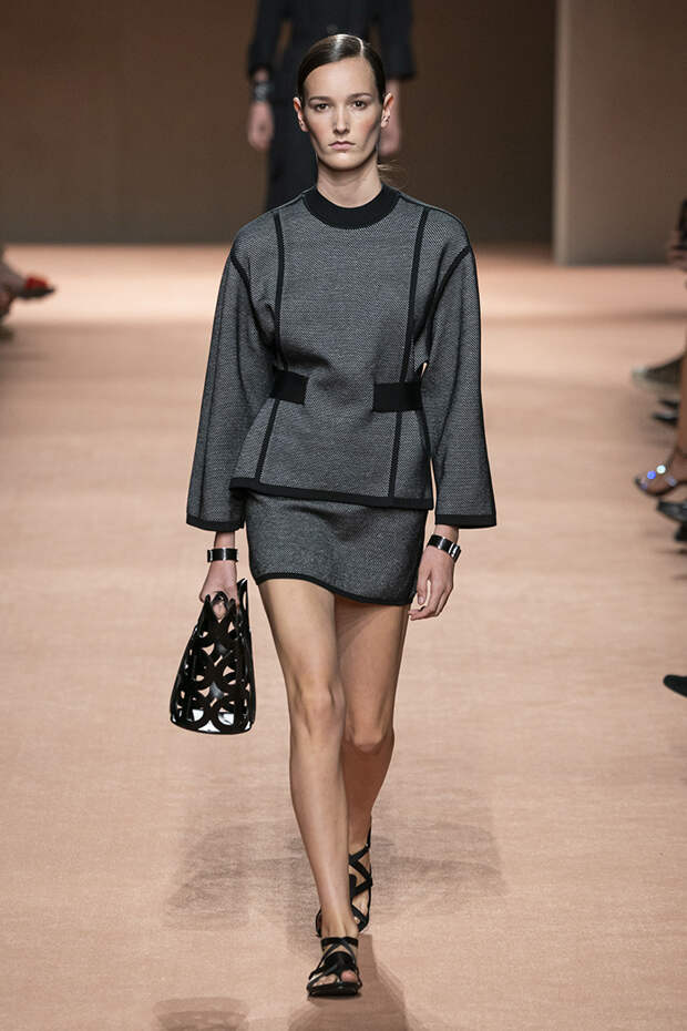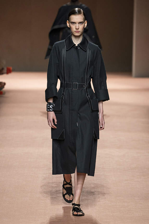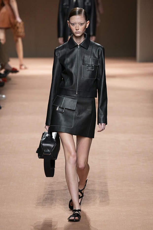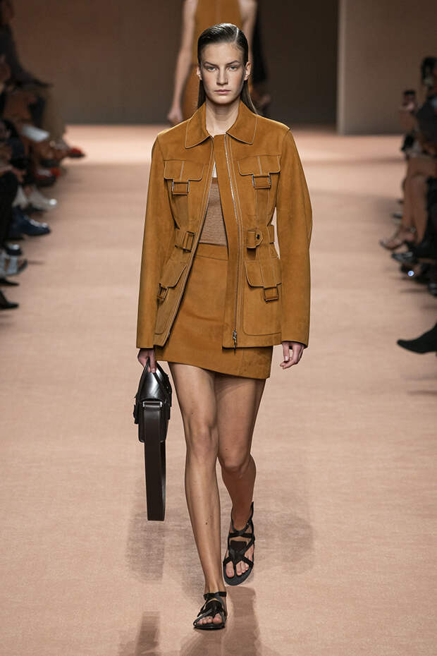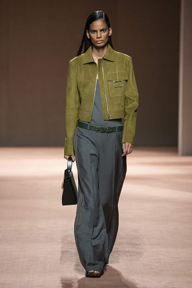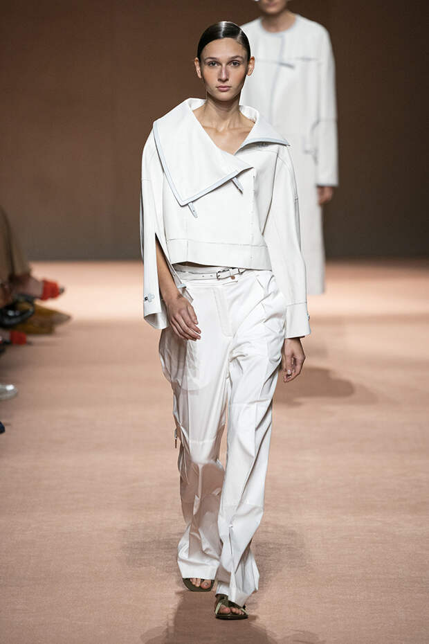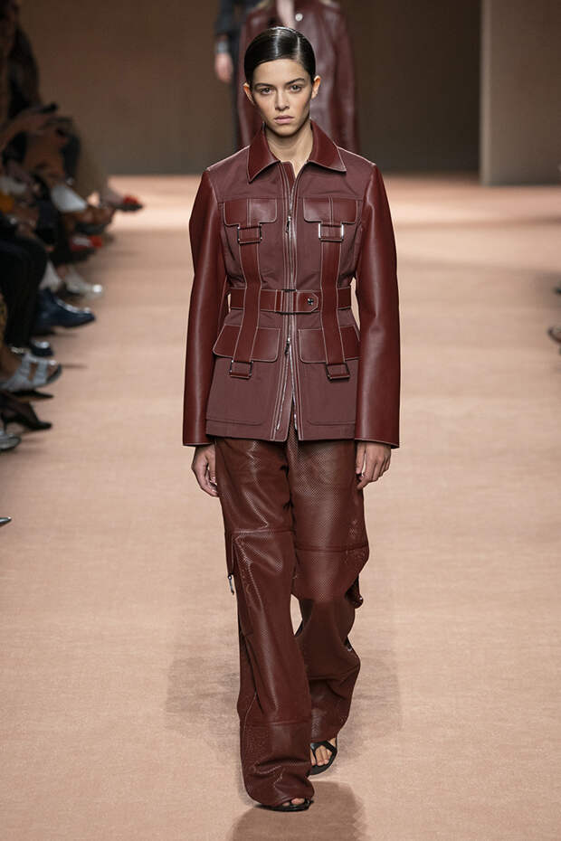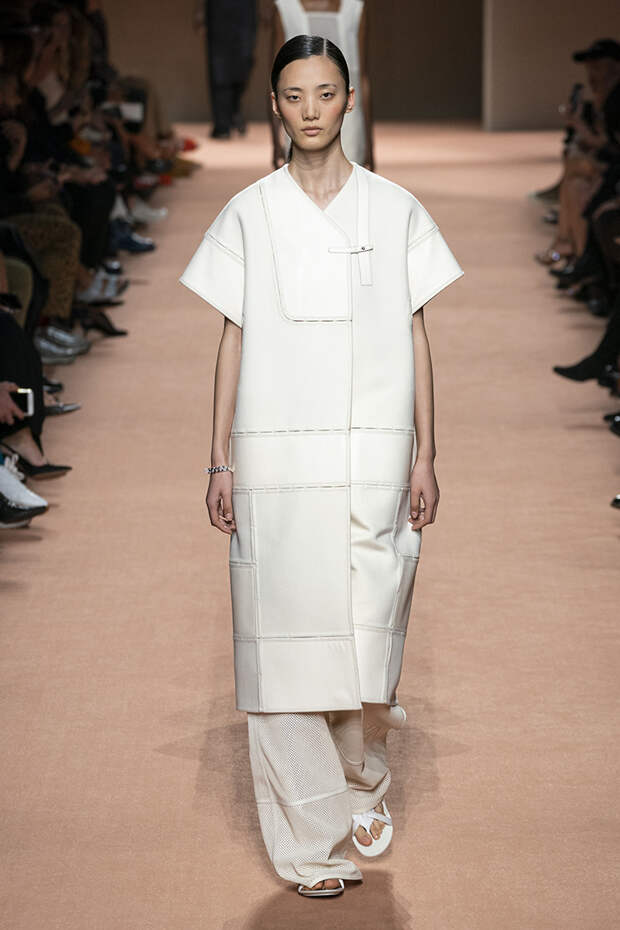 В новой коллекции все точно так же: взяв только пустынные тона и черный, Ване-Цыбульски показала минималистичные, совсем как в 90-х, вещи, в которых, с какой стороны ни посмотри, нет ничего лишнего. Отправной точкой для нее на этот раз стали фартуки, которые носили сотрудники первых мануфактур Hermès. Так что туники, надетые поверх брюк, или топы с перекрещенными лентами — отсылка именно к этому предмету рабочих гардеробов. Впрочем, и без фартуков на подиуме все было в порядке: кожаные платья, брюки и лихие плащи вновь удались.