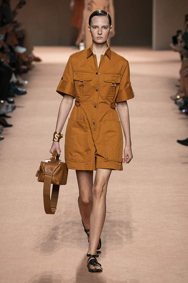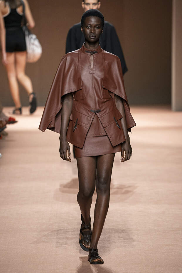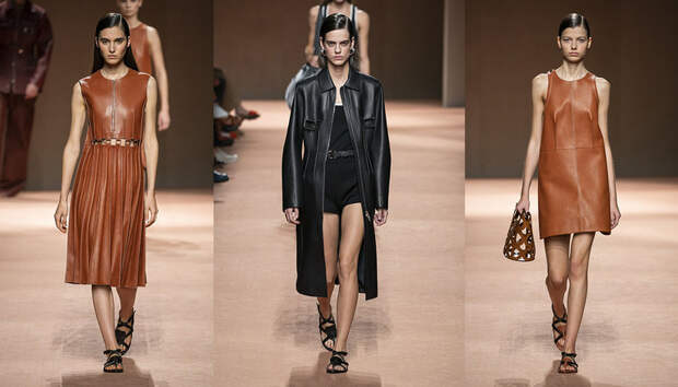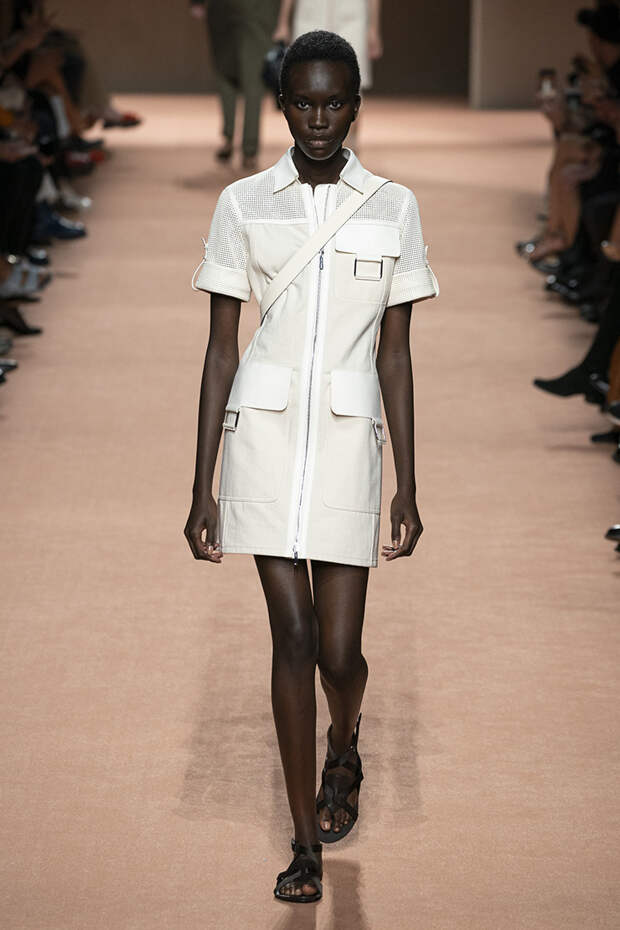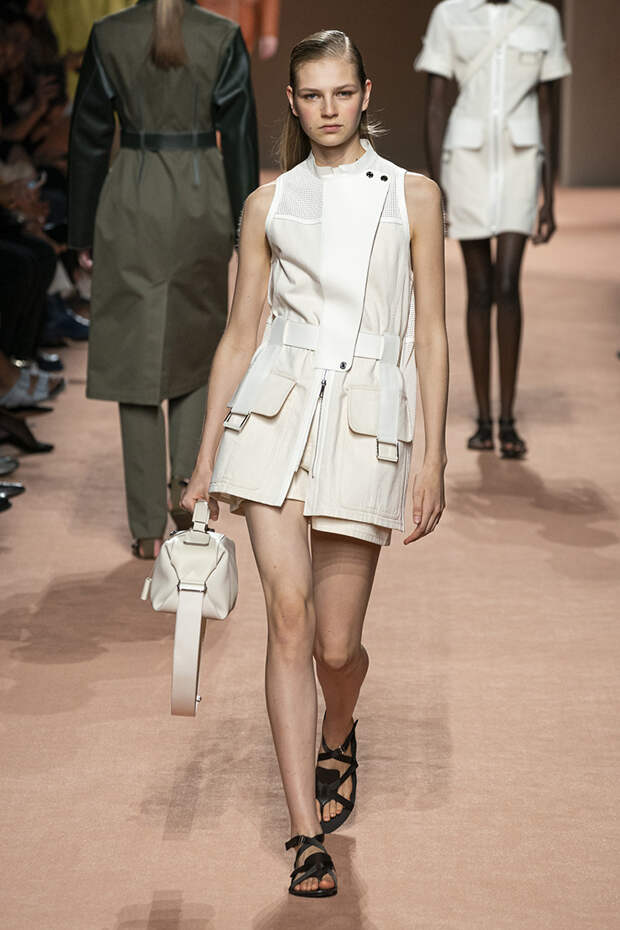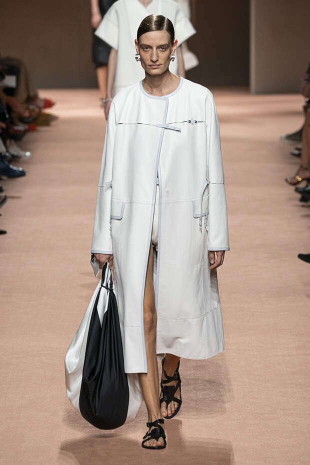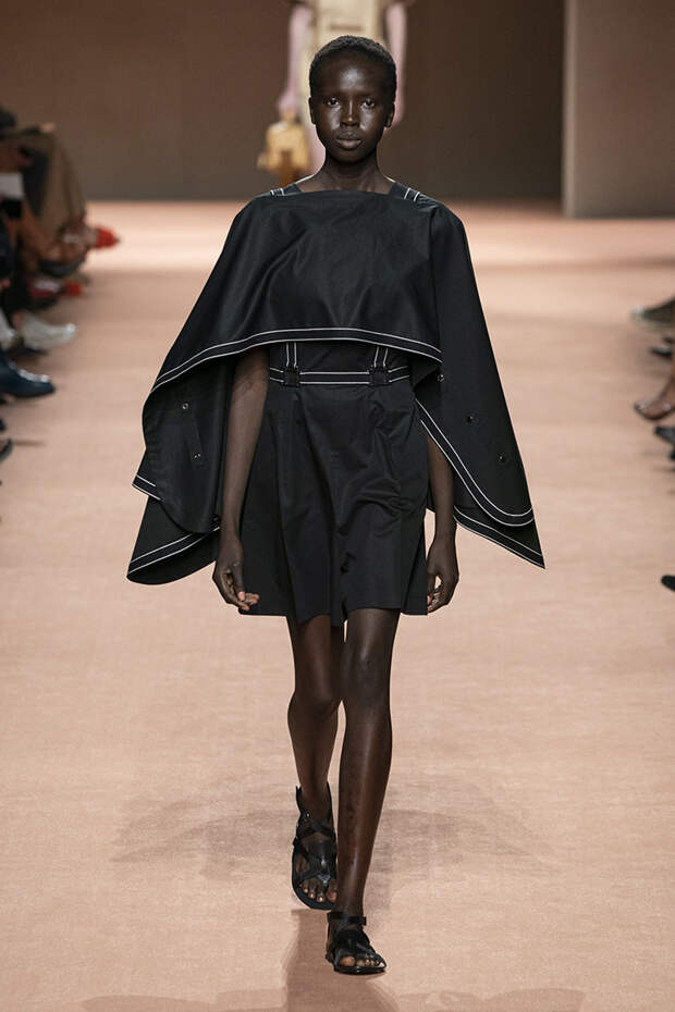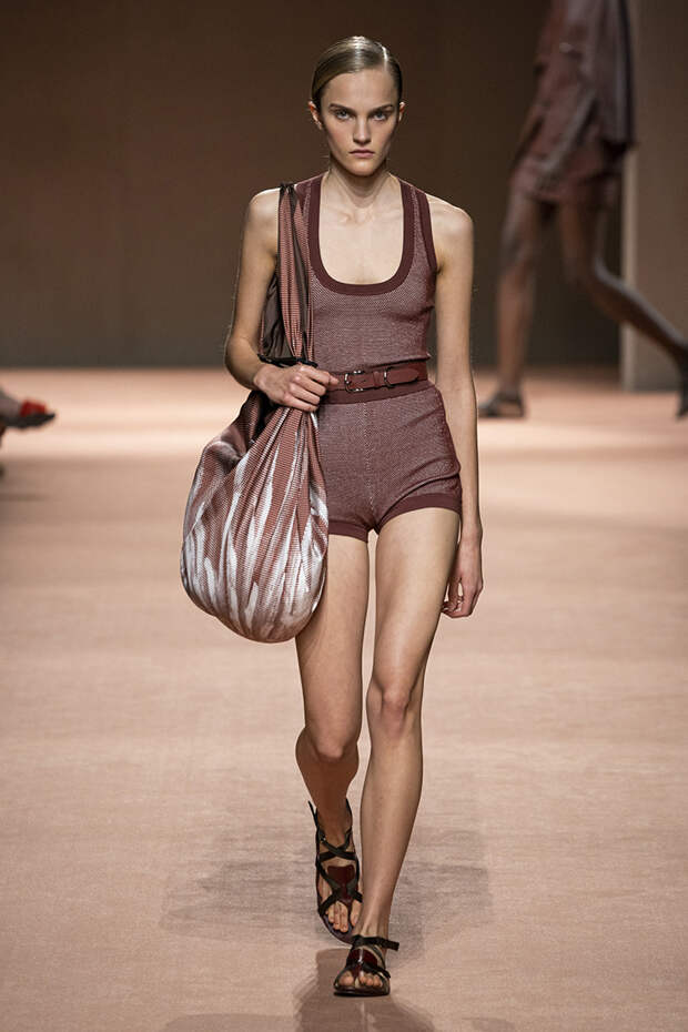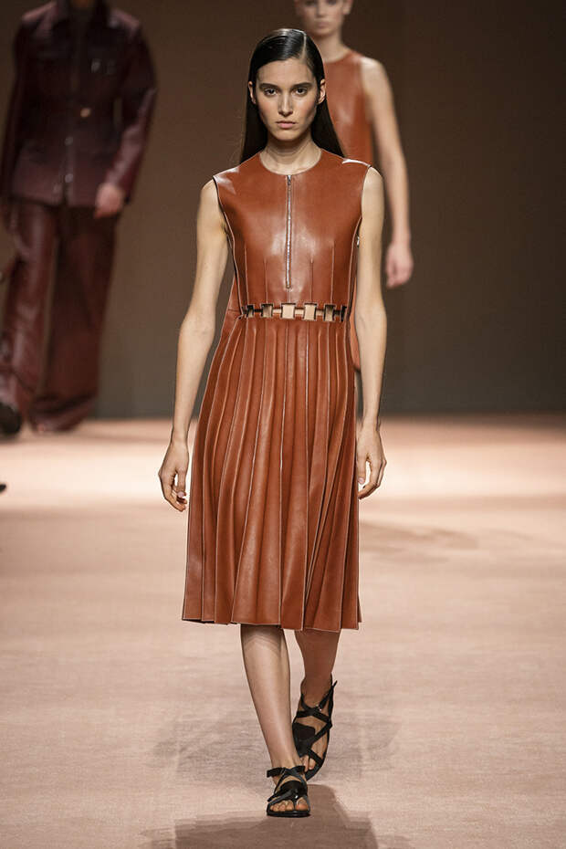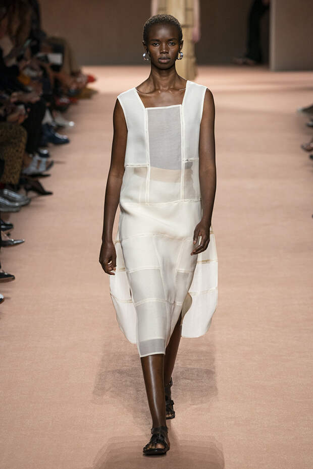В новой коллекции все точно так же: взяв только пустынные тона и черный, Ване-Цыбульски показала минималистичные, совсем как в 90-х, вещи, в которых, с какой стороны ни посмотри, нет ничего лишнего. Отправной точкой для нее на этот раз стали фартуки, которые носили сотрудники первых мануфактур Hermès. Так что туники, надетые поверх брюк, или топы с перекрещенными лентами — отсылка именно к этому предмету рабочих гардеробов. Впрочем, и без фартуков на подиуме все было в порядке: кожаные платья, брюки и лихие плащи вновь удались.