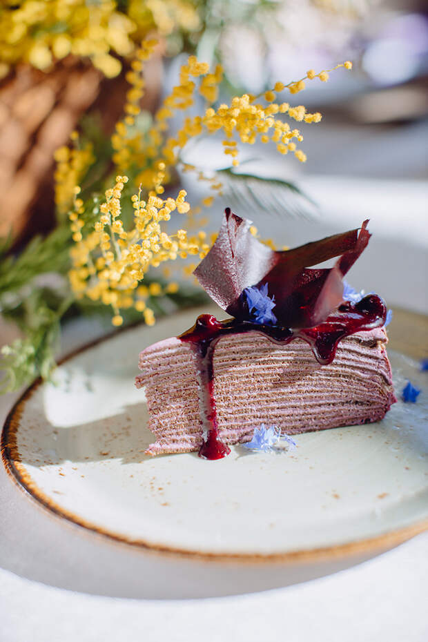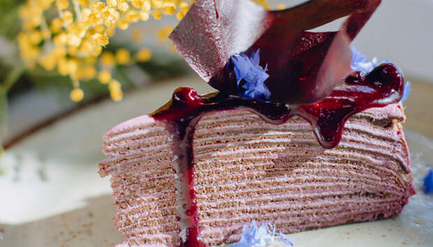Ягодное пюре смешать с сахарным сиропом и крахмалом довести до кипения, загустить и добавить ягоду черной смородины. Выкладываем блины на тарелку промазывая каждый слой кремом. Блинный торт должен постоять 2 часа, чтобы схватиться.