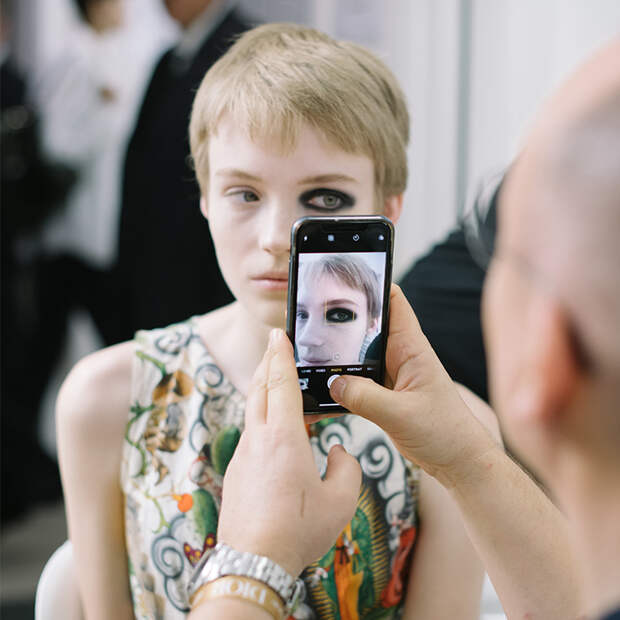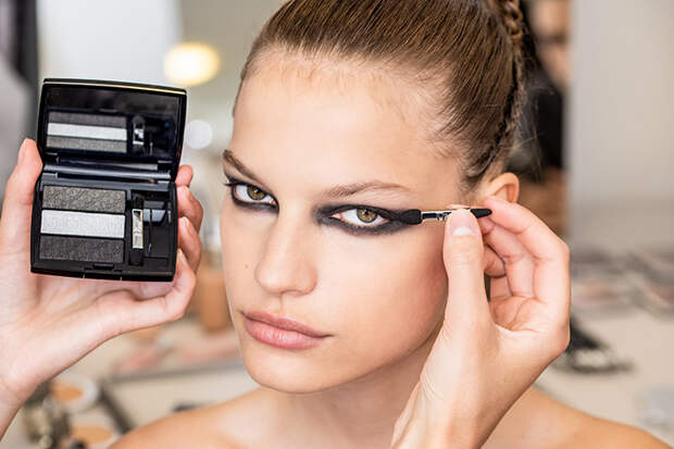 Питер Филипс, креативный директор по мейкапу, решил ограничиться угольными смоки, поэтому никаких румян, контуринга, ярких губ - ничто не отвлекает от взгляда. "Интенсивный, но мягкий эффект смоки удалось создать при помощи черного оттенка из палетки теней 3 Couleurs Tri(o)blique 053, которые нанесли на верхнее веко и по ресничному контуру нижнего века. Чтобы не перегружать образ, я отказался от туши для ресниц." Финальный штрих - немного блеска для губ в натуральном цвете и причесанные гелем брови.