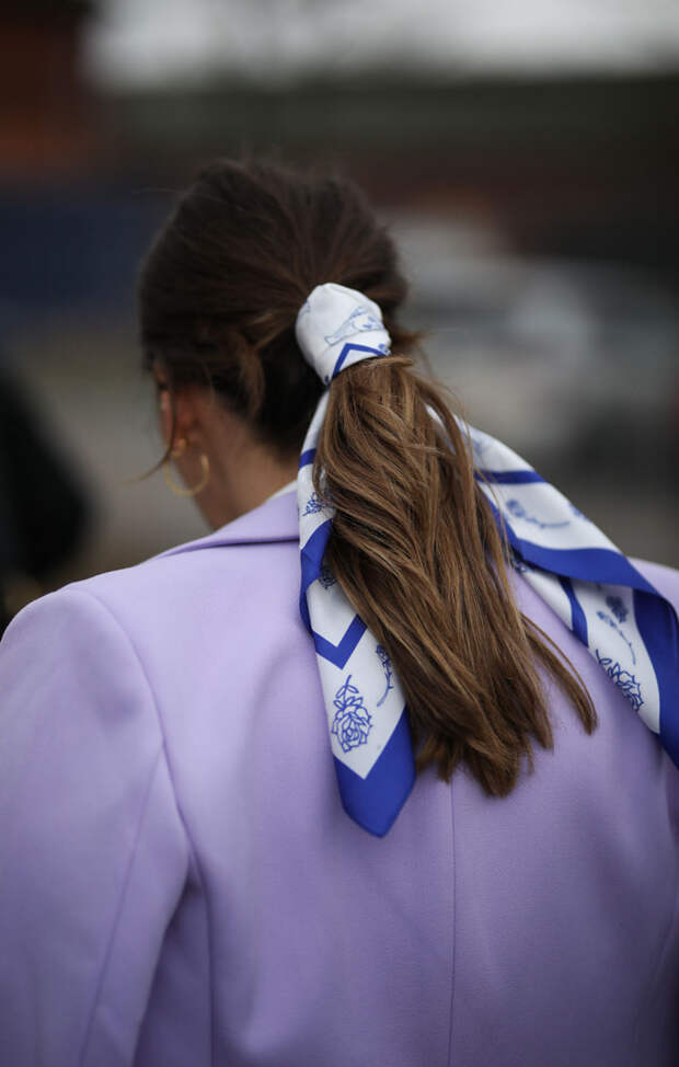 Оригинальный способ использовать шейный атласный платок - в качестве элемента прически. Повяжите платок на низкий хвост вместо обычной резинки или поверх нее, чтобы хвост был устойчивым. Концы платка могут быть как короче, так и длиннее волос - это добавит акцент. Выбирайте платок ярких и сочных цветов, которые будут играть на контрасте с нарядом, или же, наоборот, перекликаться с какой-то частью лука.