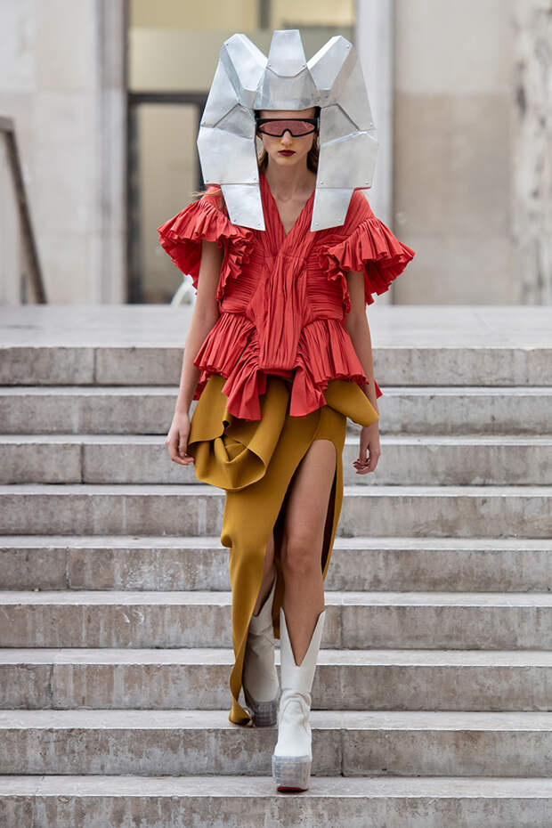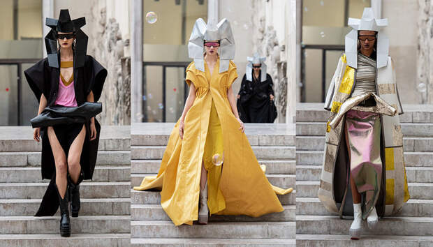 Вместо мрачных мыслей о войне и постапокалиптических фантазий дизайнер нарисовал вполне идиллическую, пусть и странную — хотя и не то чтобы слишком странному для каждого, кто знаком с коллективом Matieres Fecales. Настолько, что вместо перформансистов, грозных танцорок или кого-то вроде, как в былые времена, позвал на подиум выдувальщиков пузырей.Ретрофутуризм, появившийся в 60-х, в самом деле никогда не был попыткой понять, какой именно будет много будущего. Это была идиллическая фантазия о мире, где космос так же близко, как соседний город, где нет места стереотипам, где все ходят в белом и серебристом, словно снимаются в мечтательной научной фантастике. Образы из новой коллекции Оуэнса — примерно та же история, только в контексте 2019-ого. Да, героини похожи на инопланетянок, у них чудные прически, а платья раздуваются, словно обрастают опухолями. Но это история не про экологические кошмары, а скорее про свободы выглядеть так, как хочешь, про постоянные изменения и, конечно, тот же отказ от стереотипов. Прозрачная обувь, очки-маски, странные головные уборы, похожие на шапки космических фараонов — все это просто стандартный набор предметов из нашей новой картинки светлого будущего, в которую мы все не особенно верим.