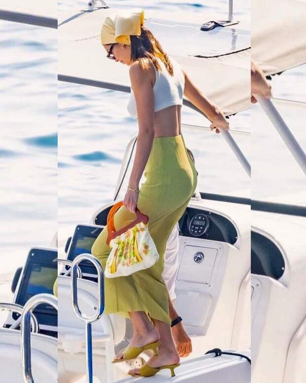 Модель собрала все тренды уходящего лета в одном луке. Во-первых, она повязала на голову шелковую косынку, которая защитит от солнца не хуже любой бейсболки. Во-вторых, она надела модный кроп-топ в стиле конца 90-х и начала 2000-х. В-третьих, выбрала облегающую юбку-макси из тонкого трикотажа в рубчик — еще одна примета модного сейчас стиля конца 90-х. Один из главных оттенков уходящего лета — неоновый цвет лайма. Этот тренд девушка тоже поддержала цветом той самой юбки, мюлей на небольшой шпильке и пластикового чокера на шее. Завершающая деталь — небольшая ретро-сумочка с пластиковой ручкой и ярким рисунком.