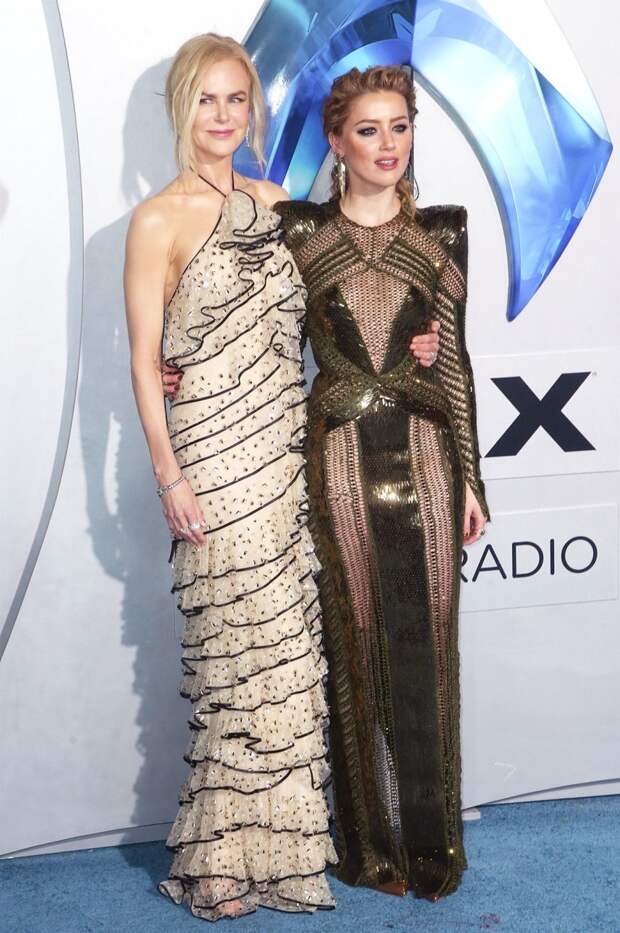 Херд вновь пришлась по душе морская тематика, близкая по духу ее героине Мере: платье из тонкой сетки болотного оттенка с переливающимися пайтеками, словно невод, облегало фигуру Херд. Компанию нашей героине на красной дорожке в Лос-Анджелесе составила Николь Кидман в бежевом каскаде от Armani Prive, причем никто не мог бы сказать, что между актрисами разница в возрасте почти в 20 лет.