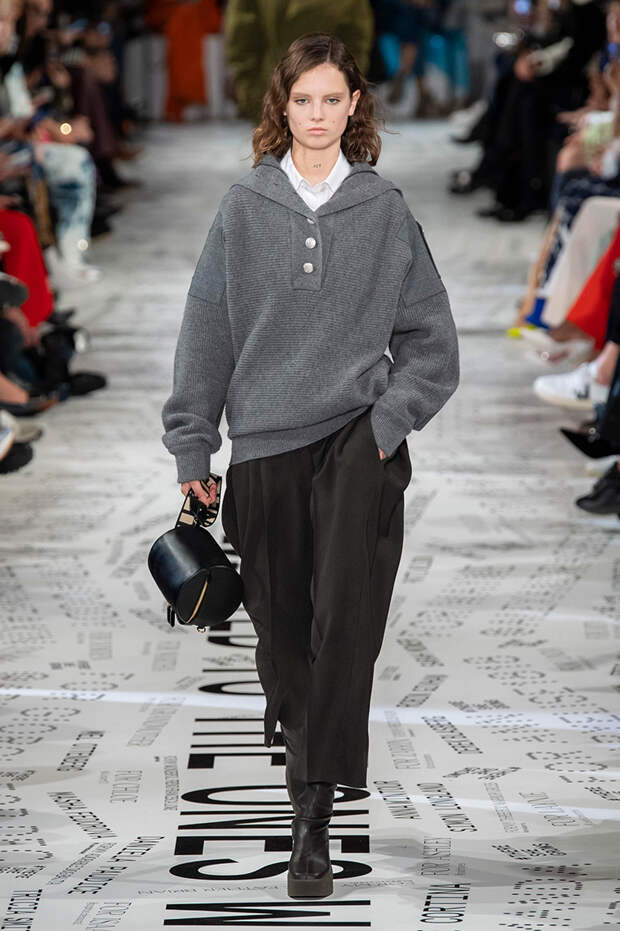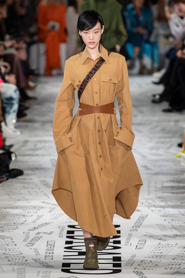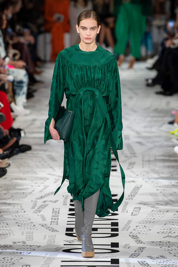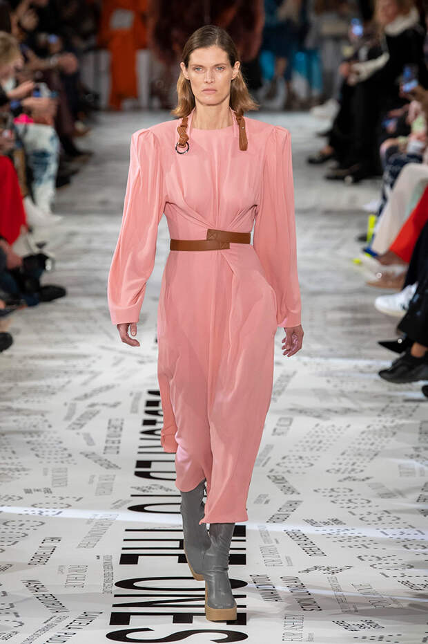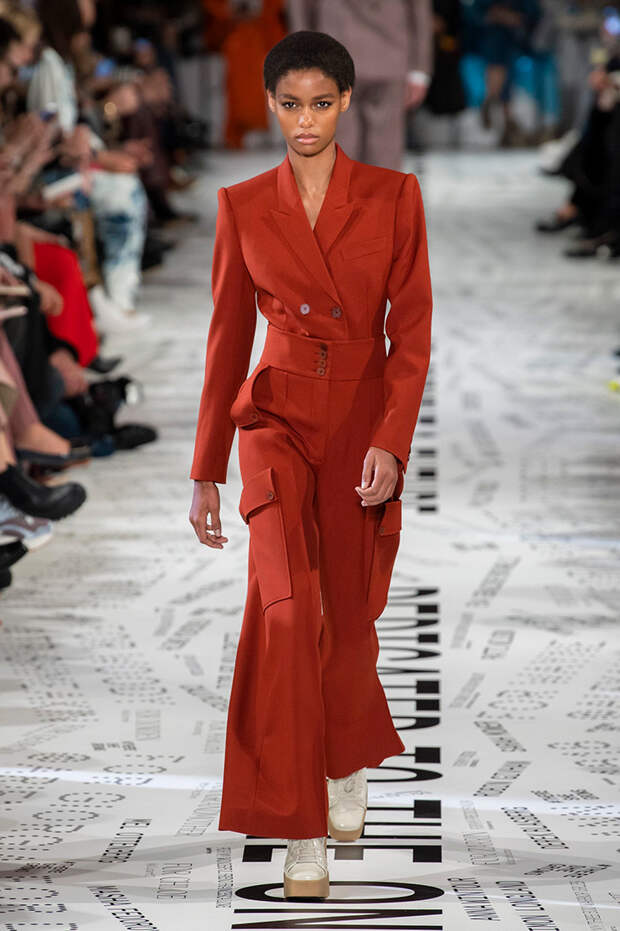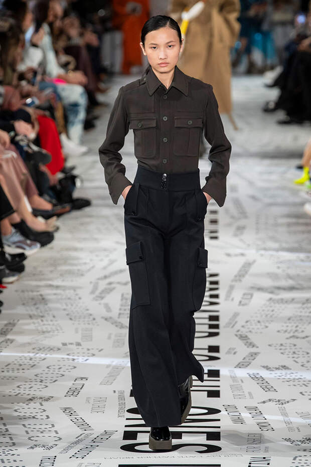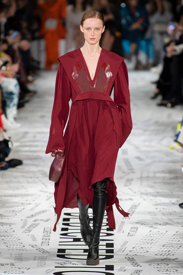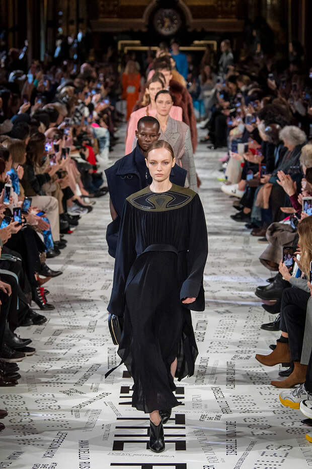 Без гипертрофированно широких плеч не обошлась, кажется, ни одна коллекция Парижской недели моды. Не осталась в стороне и Стелла Маккартни — и пальто, и платья, и жилеты вышли на этот раз генеральскими. Причем в прямом смысле: стиль милитари тоже стал одной из основных линий сезона. Впрочем, сочетание жестких линий и брутальных силуэтов с природной плавностью — основа стилистики Дома в целом, так что сюрпризом их появление точно не стало.