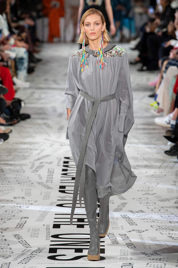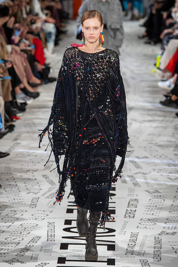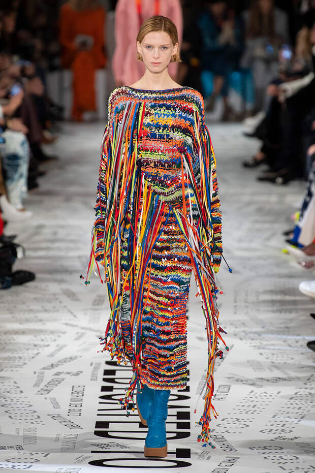 За природу и мягкость на этот раз отвечали вещи, сделанные с использованием народных декоративно-прикладных техник. Появились на подиуме и пестрые платья, похожие на плетеные домашние коврики, и пояса, шарфы и серьги в технике макраме.