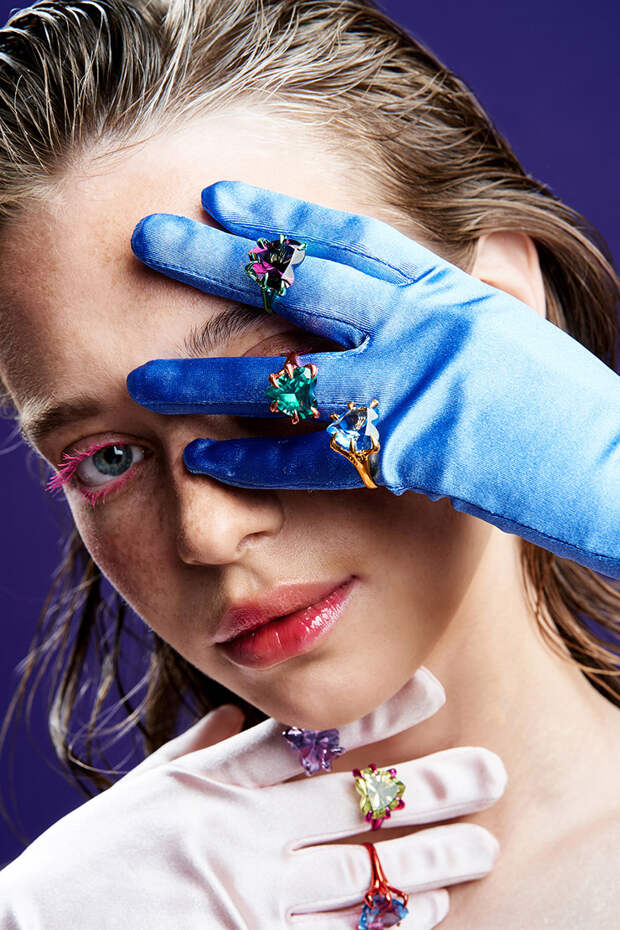 Этой осенью Диана Джанелли решила перевыпустить коллекцию Rock, которая за 5 лет существования успела влюбить в себя многих клиенток Dzhanelli Jewellery. В каждом изделии солирует фианит огранки “сердце”: изумрудный, фуксия, насыщенный фиолетовый, нежно-голубой и индиго, сиреневый и искрящийся желтый — сочетайте кольца так же смело, как на кадрах лукбука.