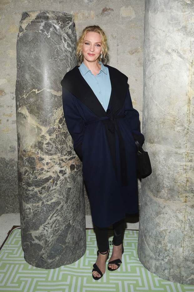 А вот от верхней одежды отказываться не стала: на серо-голубую сорочку и кожаные скинни Ума накинула синее пальто-халат с черным декором — и в столь минималистичном образе наша героиня сумела затмить всех в этот вечер.
