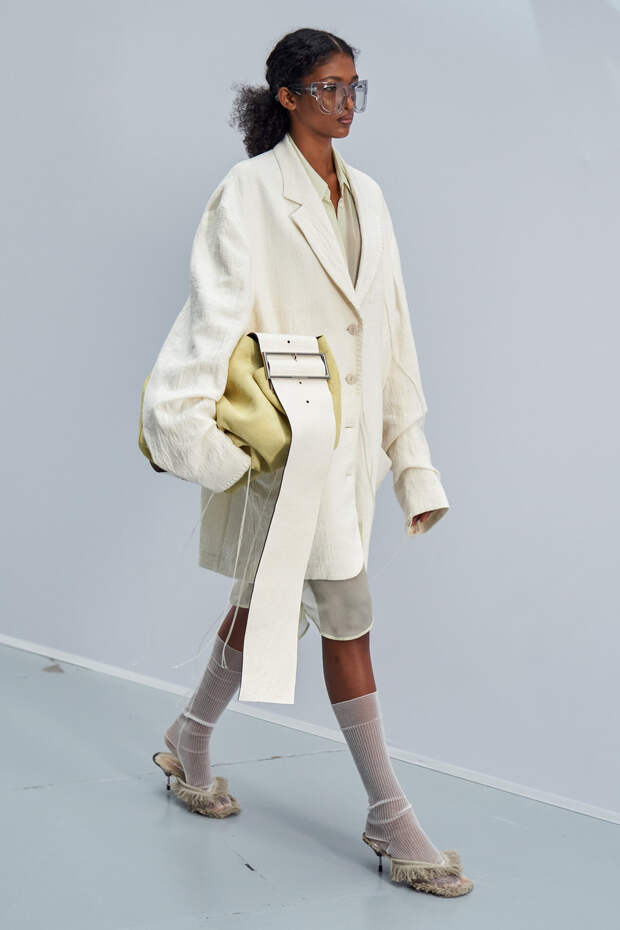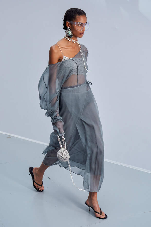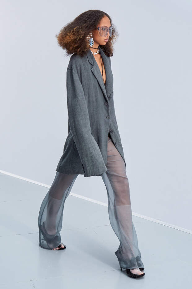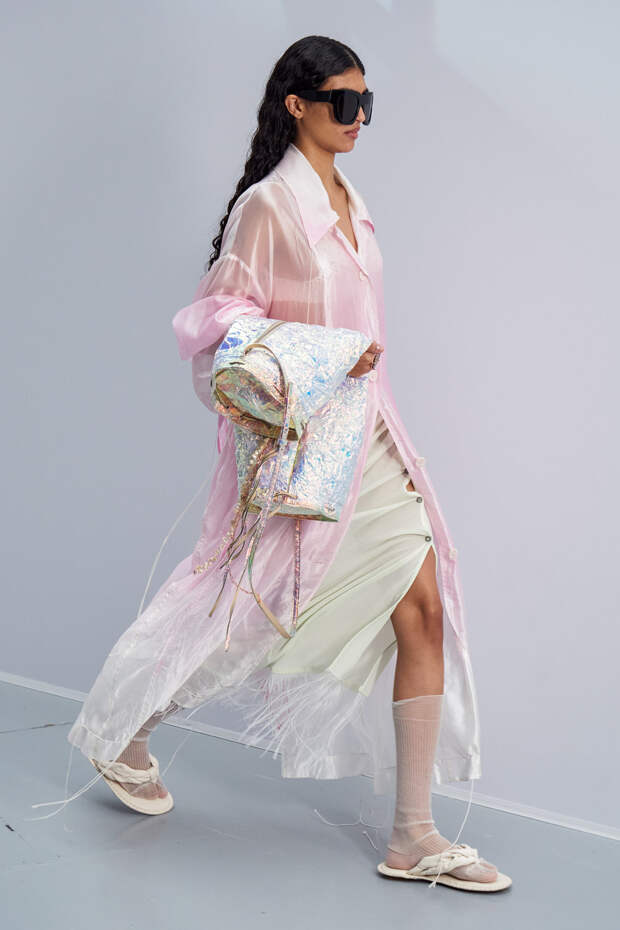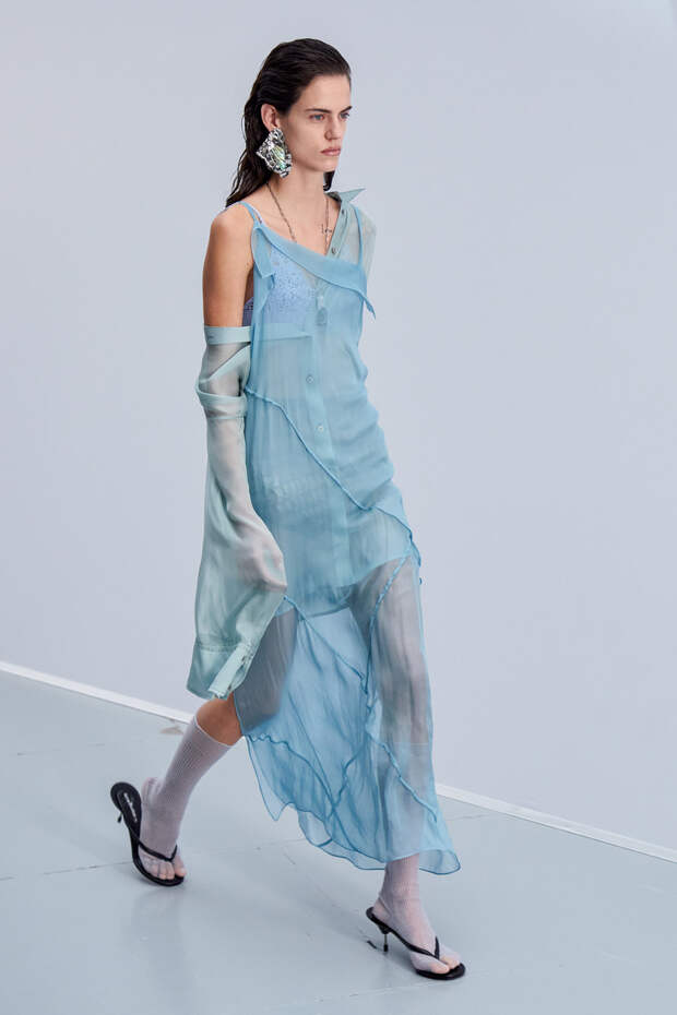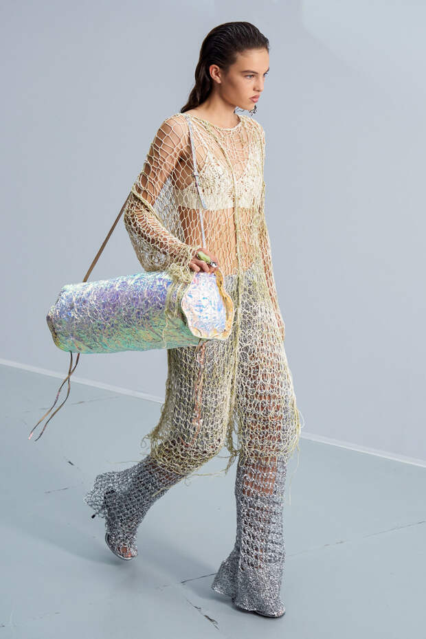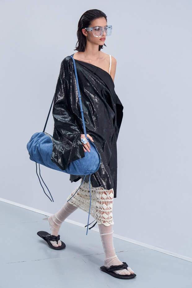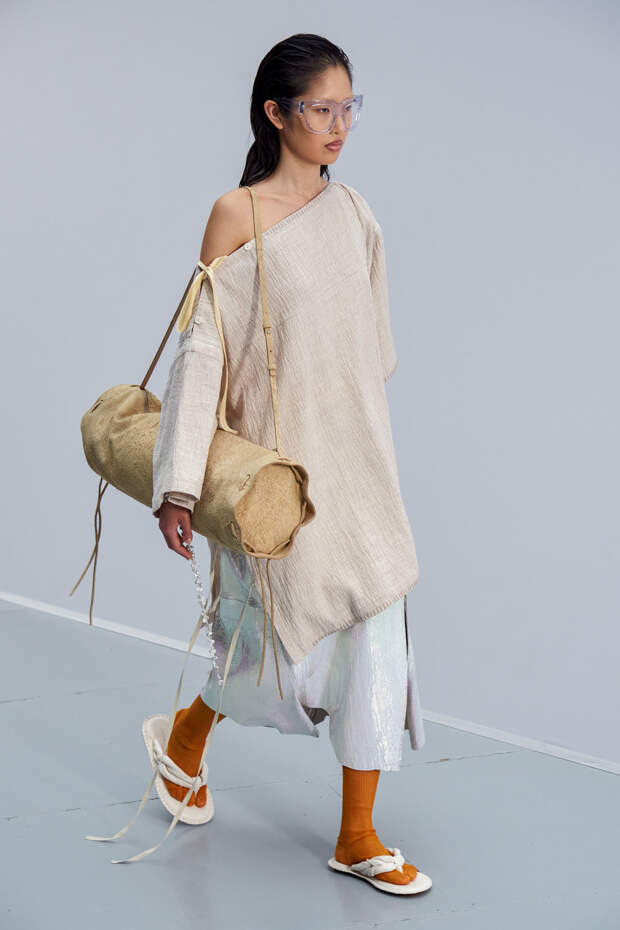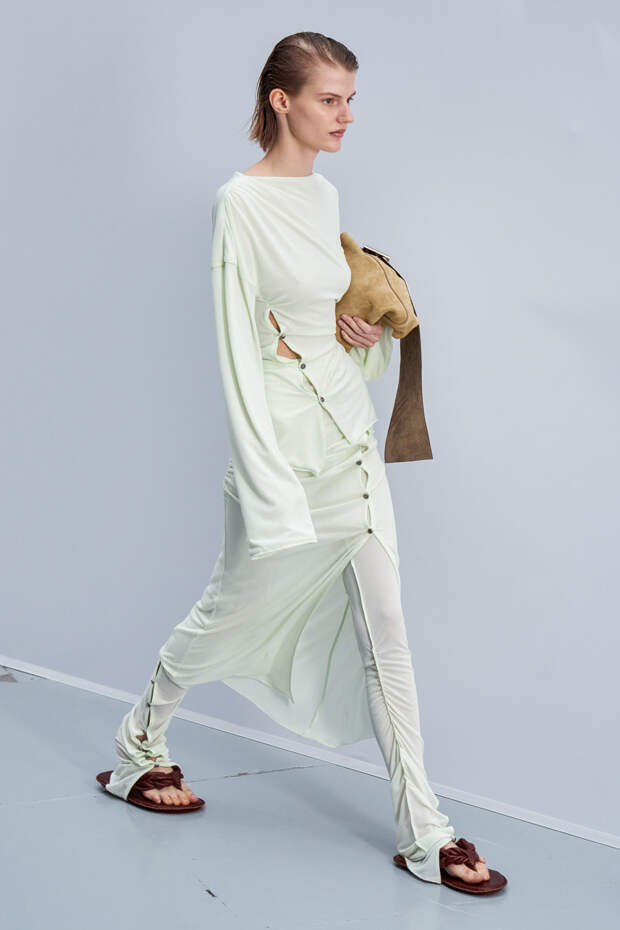 Здесь появились все ключевые элементы стиля Acne Studios, но будто пропущенные через фильтр инстаграма. Оттенки стали мягкими и нежными, привычный тейлоринг — куда более расслабленным и менее жестким. На смену плотным, жестким тканям пришли мягкие жатые фактуры — в таких идеально гулять летом по морскому побережью. Дополнили все образы макси-клатчи (такие же мягкие и "мятые", как платья и топы) и уже практически ставшие общим местом (спасибо модным блогерам), но все еще очень эффектные босоножки-вьетнамки с перемычками в стиле 90-х.