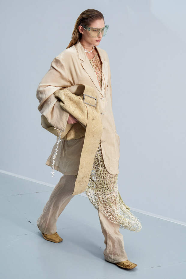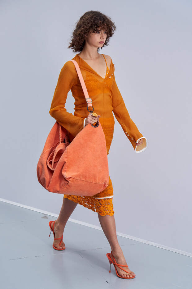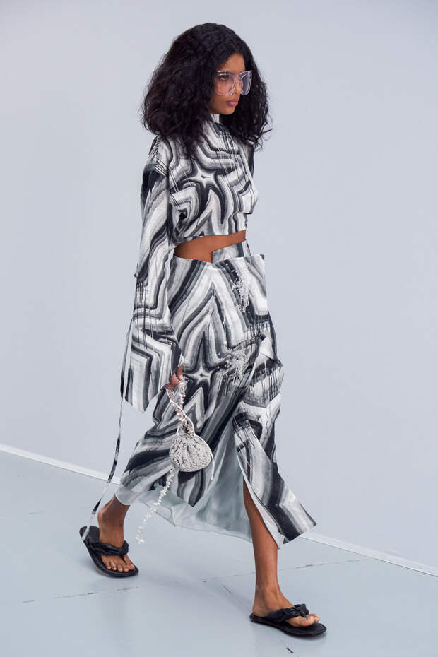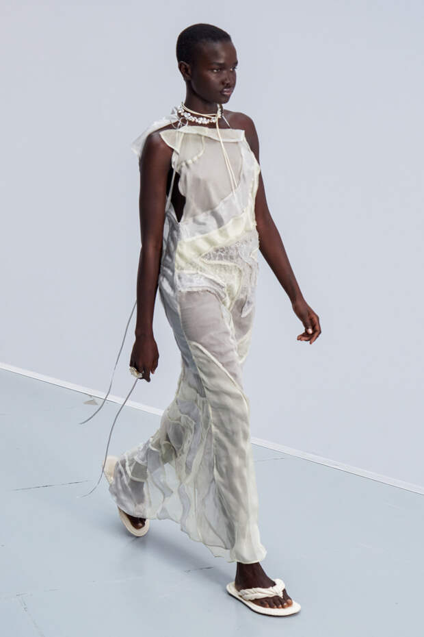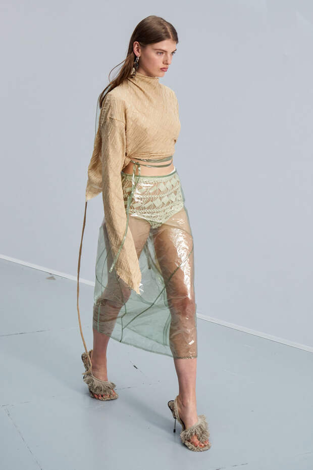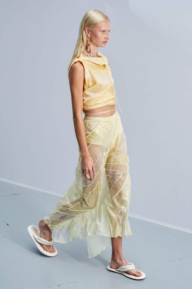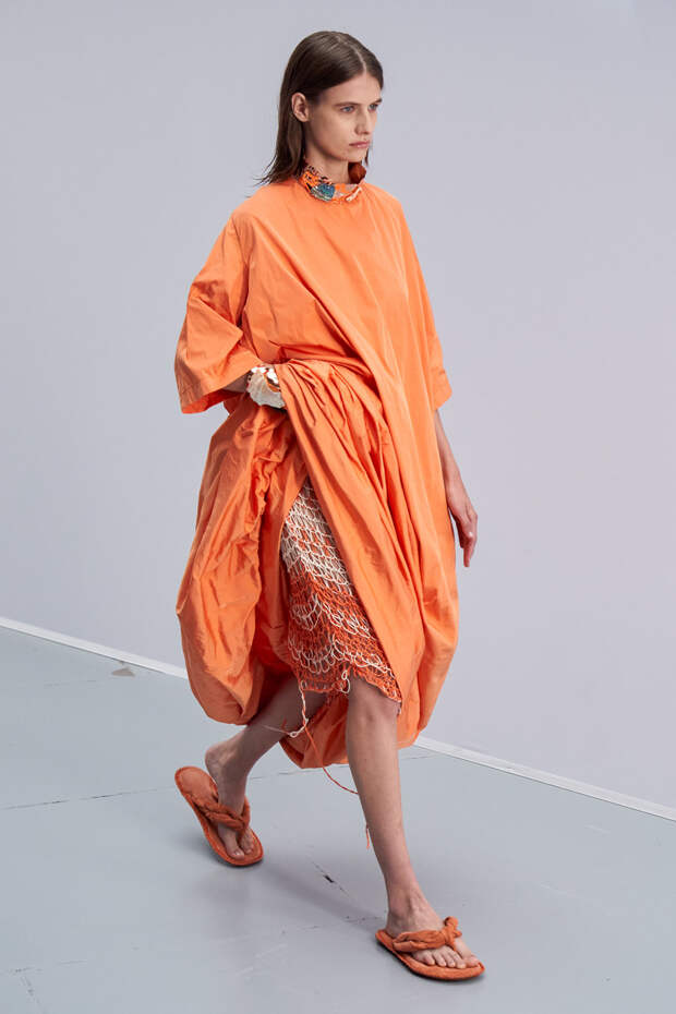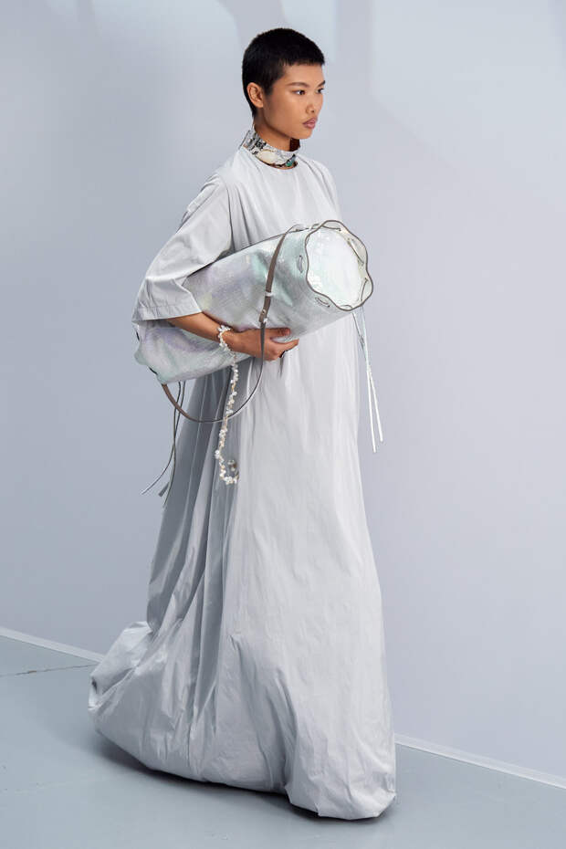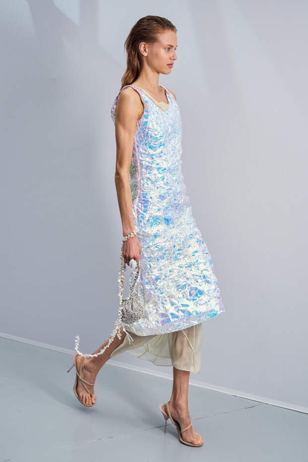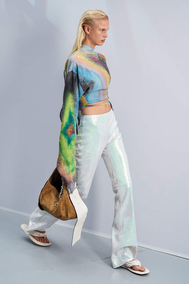 Здесь появились все ключевые элементы стиля Acne Studios, но будто пропущенные через фильтр инстаграма. Оттенки стали мягкими и нежными, привычный тейлоринг — куда более расслабленным и менее жестким. На смену плотным, жестким тканям пришли мягкие жатые фактуры — в таких идеально гулять летом по морскому побережью. Дополнили все образы макси-клатчи (такие же мягкие и "мятые", как платья и топы) и уже практически ставшие общим местом (спасибо модным блогерам), но все еще очень эффектные босоножки-вьетнамки с перемычками в стиле 90-х.