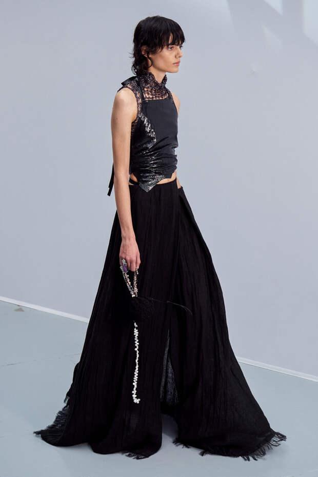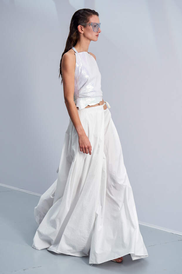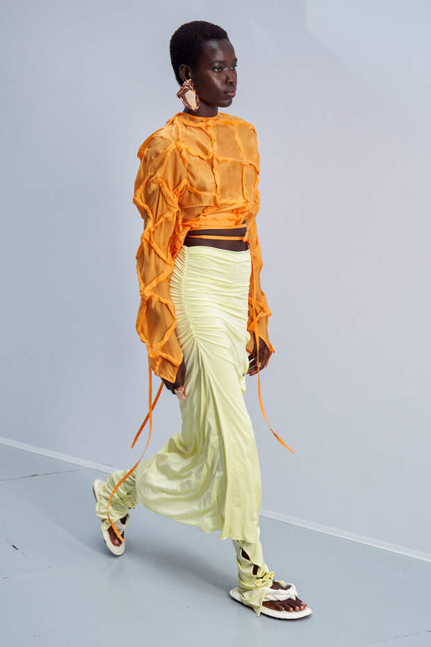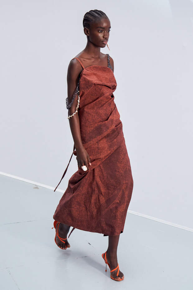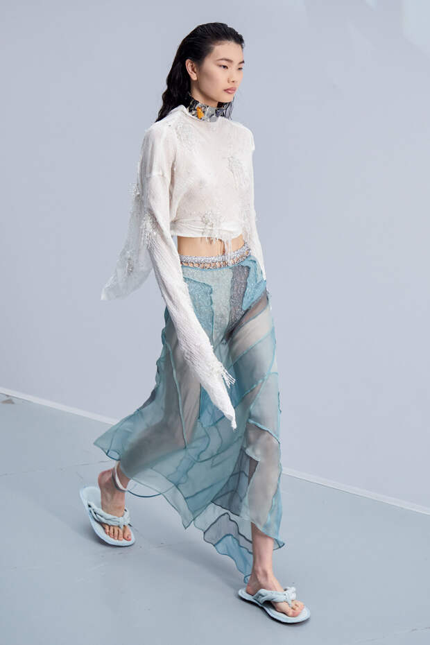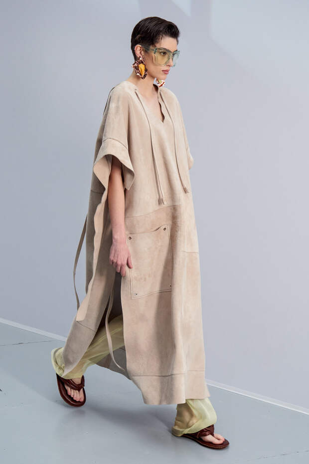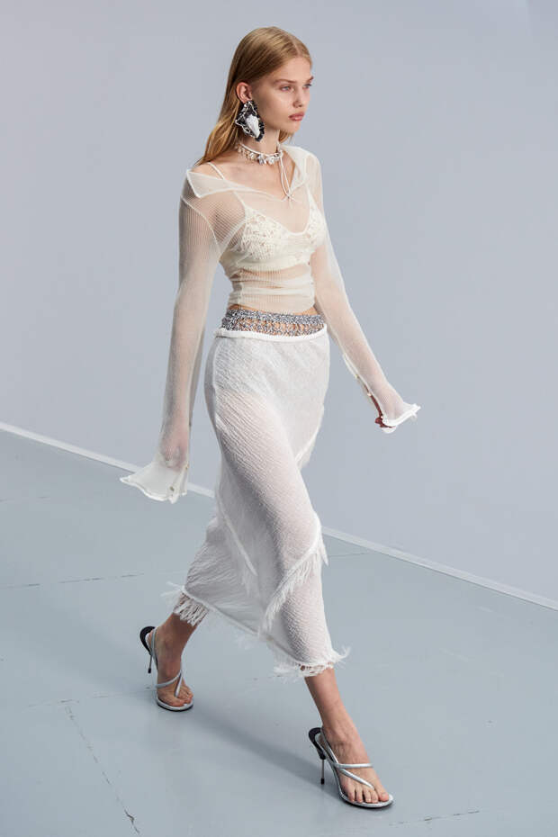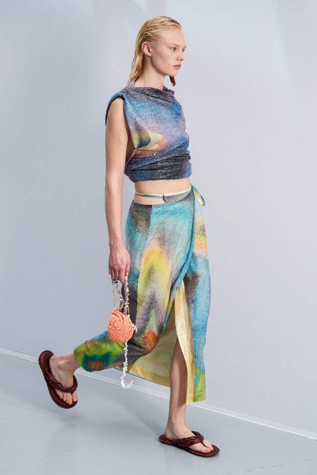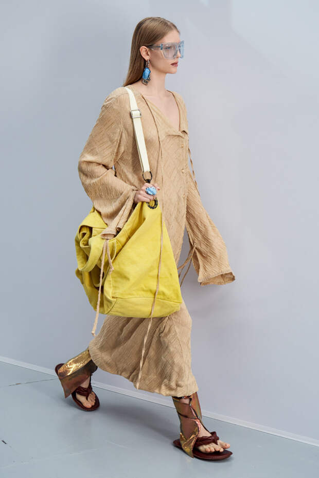 Здесь появились все ключевые элементы стиля Acne Studios, но будто пропущенные через фильтр инстаграма. Оттенки стали мягкими и нежными, привычный тейлоринг — куда более расслабленным и менее жестким. На смену плотным, жестким тканям пришли мягкие жатые фактуры — в таких идеально гулять летом по морскому побережью. Дополнили все образы макси-клатчи (такие же мягкие и "мятые", как платья и топы) и уже практически ставшие общим местом (спасибо модным блогерам), но все еще очень эффектные босоножки-вьетнамки с перемычками в стиле 90-х.