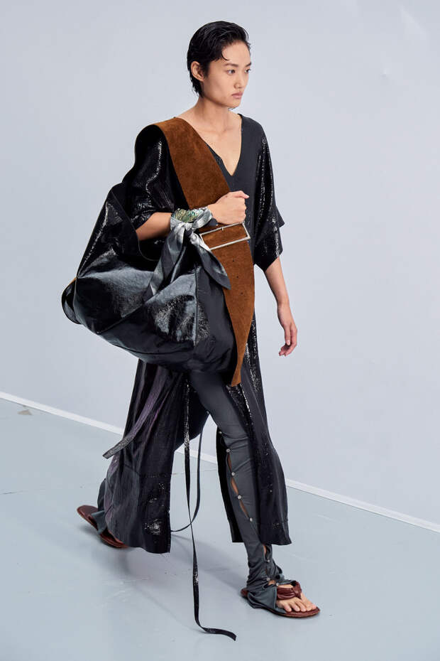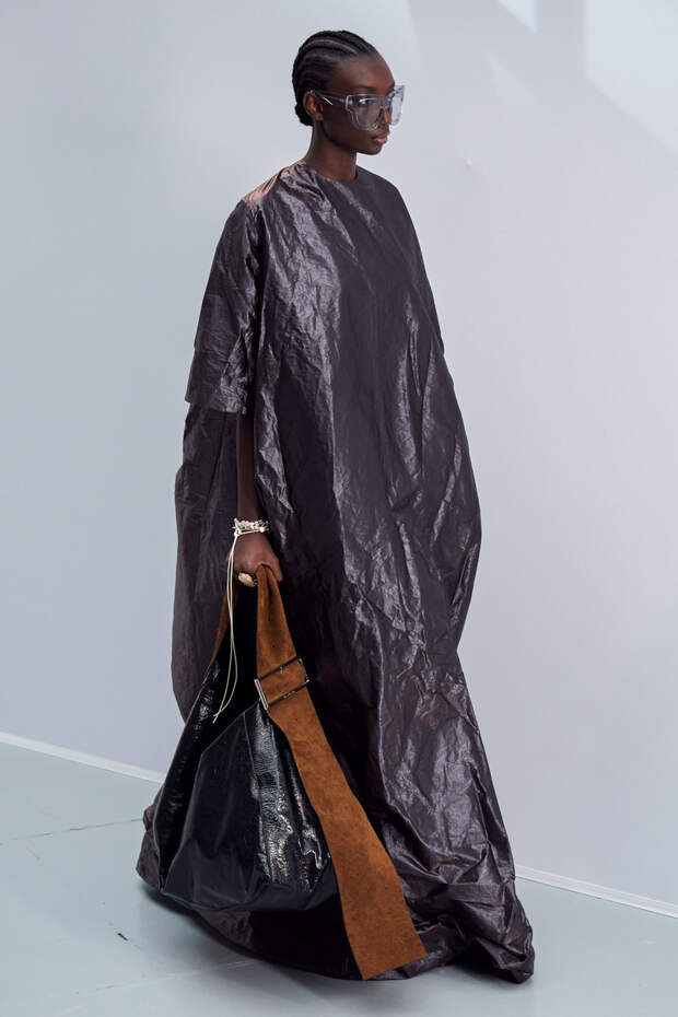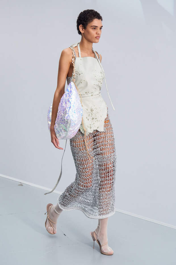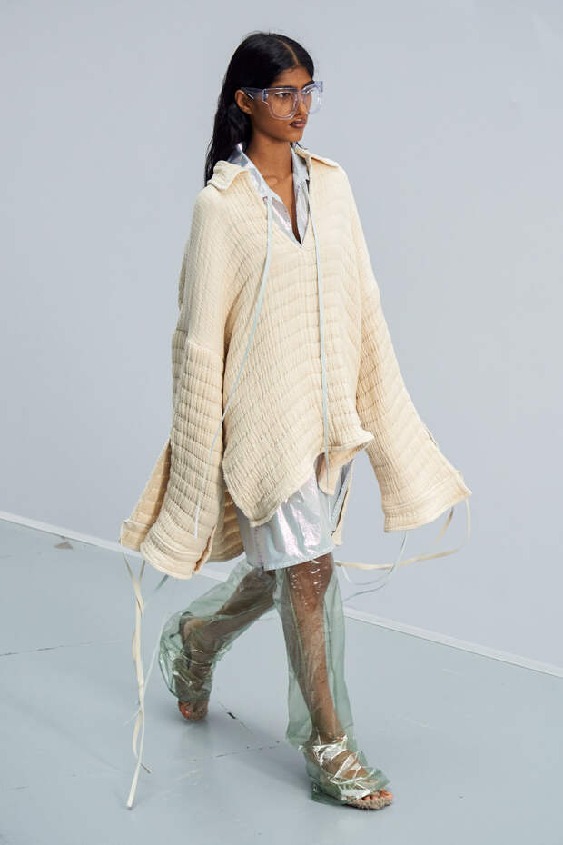 Особенно внимания также заслуживают металлизированные ткани — тоже жатые, похожие на мятую фольгу. Вообще игра с фактурами — всегда сильная сторона Acne Studios, поэтому нет ничего удивительного в том, что они решили сделать акцент именно на ней. И не прогадали.