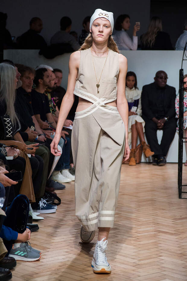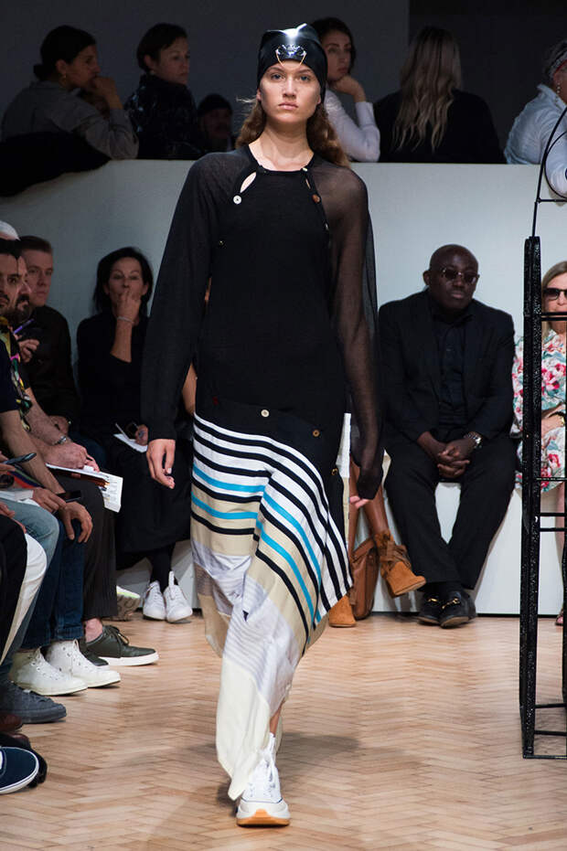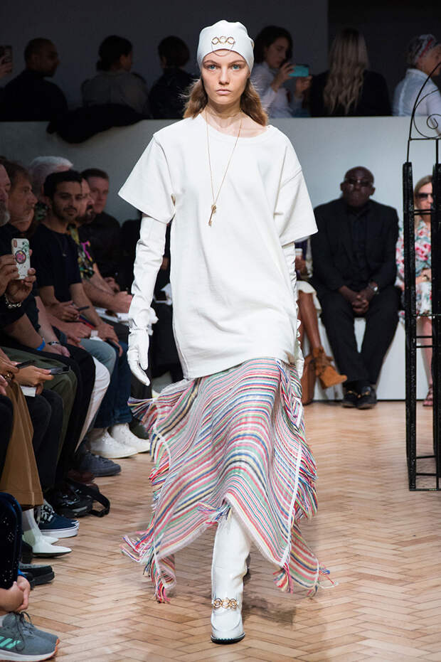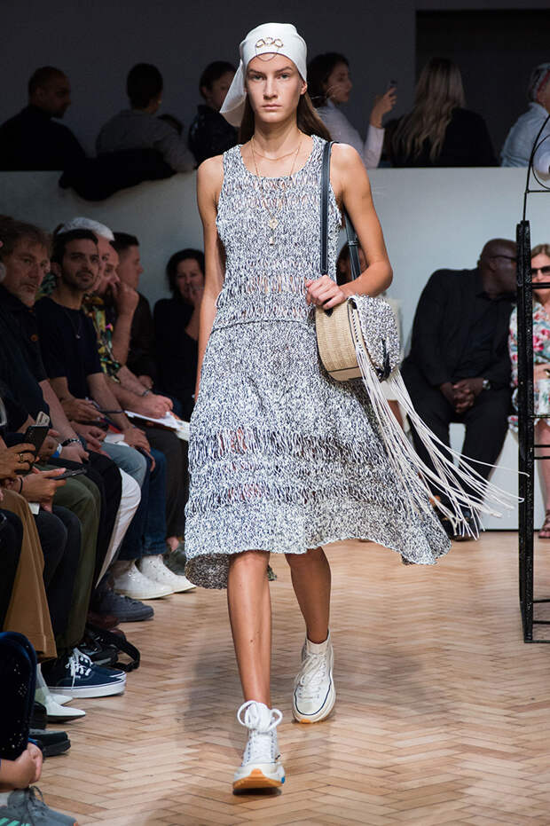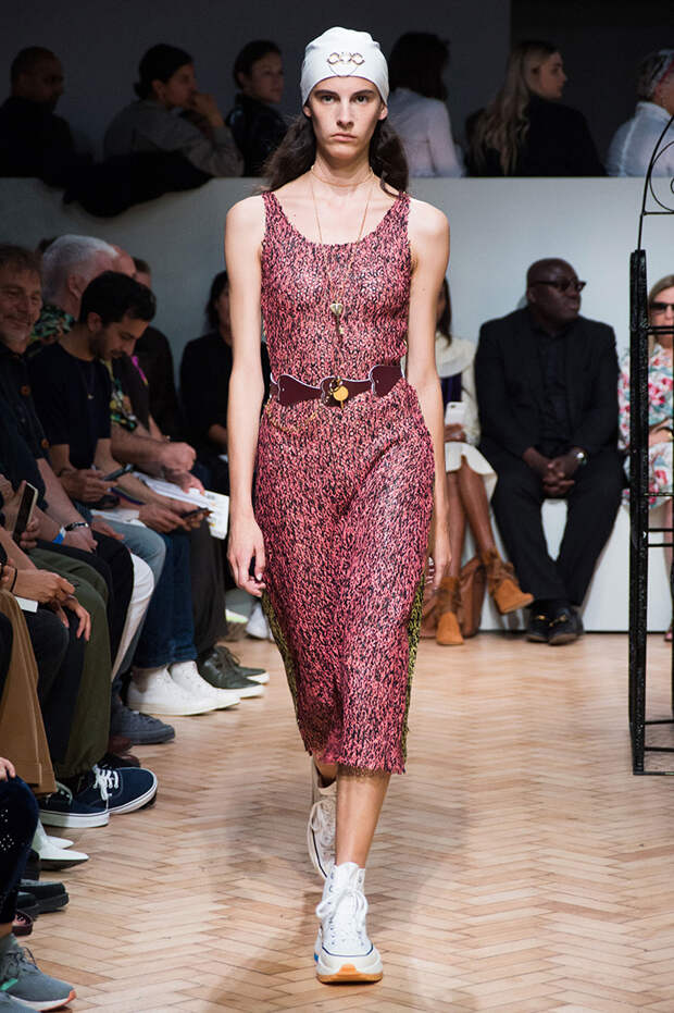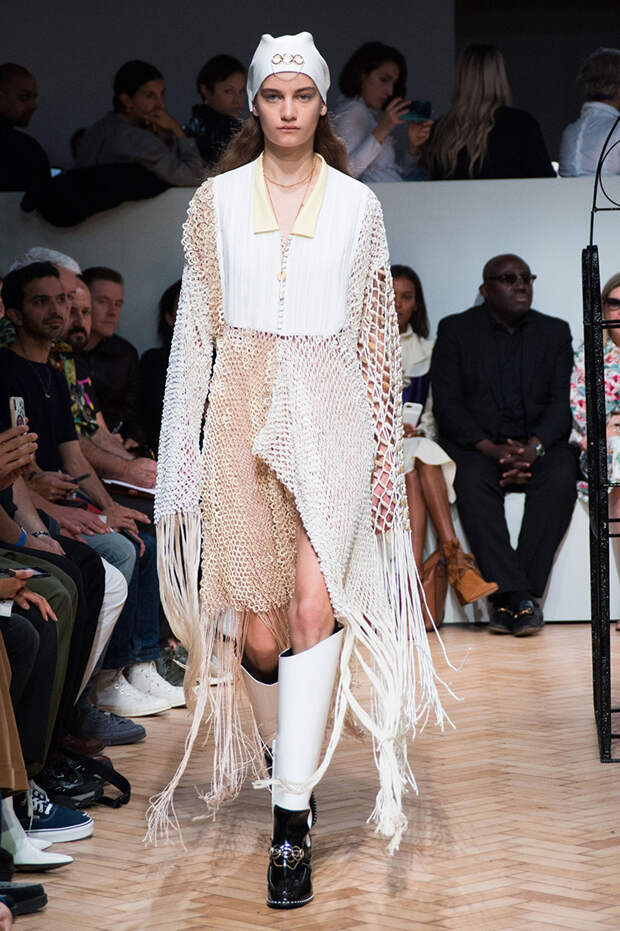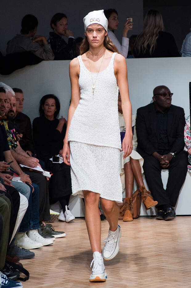 Были и ассиметричные юбки, с неровным, как будто перекошенным подолом. Также платья, выполненные полностью в технике макраме с длинной бахромой и плетеной манишкой. А еще шаровары с прорезями на талии и широкими ремнями. Из обуви — классические кеды, к которым добавилась подошва от кроссовок, больше похожая на платформу, и сапоги с широким голеницем, которое собирается гармошкой. Возможно, это и есть одежда будущего — без фольги и пластика, но свободного направления.
