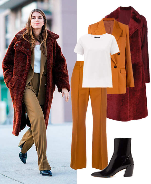 Блейзер ACNE STUDIOS, 41 391 руб.; майка WEEKEND MAX MARA, 4 361 руб.; брюки ACNE STUDIOS, 22 076 руб.; шуба DROME, 119 689 руб.; ботильоны CHLOÉ, 38 974 руб.