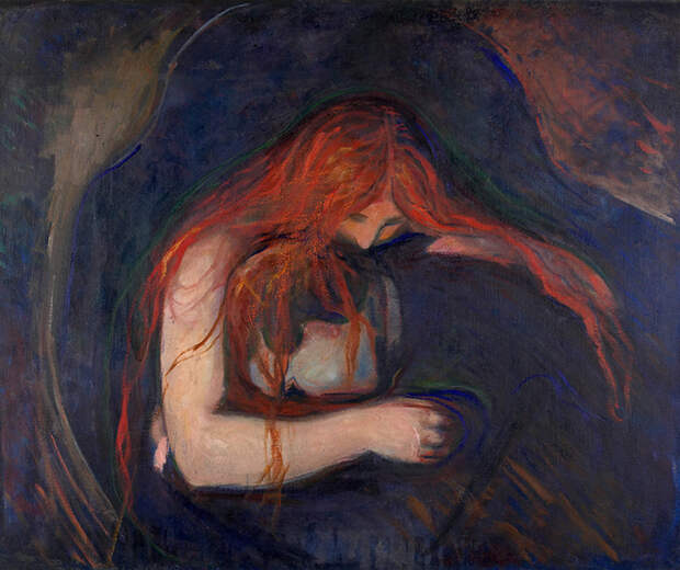 В его картинах слишком много личного. Мунк, слывший самым красивым мужчиной Христиании (бывшее название Осло), в молодые годы вел разгульный образ жизни, но в любовных отношениях не был счастлив, так и остался холостяком. Что неудивительно: одна из возлюбленных, Тулла Ларсен, шантажировала его самоубийством, а когда он пытался выхватить у нее пистолет, прострелила ему палец. Из-за другой любовницы, общей с его другом – скульптором Густавом Вигеландом, тот швырнул в него скульптурой и чуть не убил. В треугольнике, возникшем между Мунком, польским писателем Станиславом Пшибышевским и его женой, норвежской пианисткой Дагни Юль, художник чувствовал себя глубоко виноватым. Вот почему на многих его картинах эротическое, сексуальное – это синонимы вины и стыда, а женщина – источник угрозы, как в «Вампире», где она впивается в мужскую шею; разочарования – как в «Ревности», где на фоне обнимающейся пары изображен мужчина с искаженным лицом; или потери идентичности – как в «Поцелуе», где лица сливаются до полного неразличения.