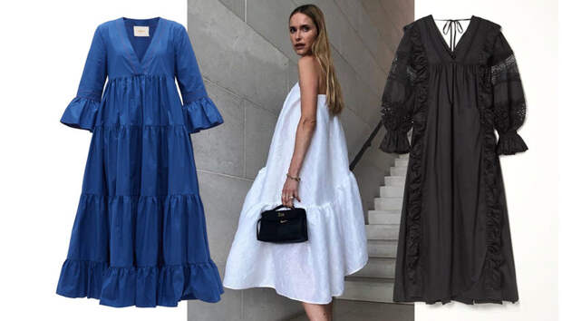Добавьте красок в свой летний гардероб с помощью платьев модных ярких оттенков: оранжевого, розового, синего, лилового. Такую сочную палитру можно найти у H&M, Asceno и Merlette. Отдайте предпочтение однотонным моделям без принтов, чтобы образ с обилием деталей не выглядел еще более перегруженным. Чтобы "сгладить" излишнюю романтичность наряда, сочетайте платья с минималистичными элементами: базовым жакетом, босоножками на тонких ремешках и нежными украшениями. Не забывайте про аксессуары - в повседневный лук идеально впишутся шляпы или банданы и расслабленные соломенные сумки, а для вечернего образа подойдет структурный клатч. Комбинируйте летящее свободное платье с грубыми высокими ботинками или казаками и оверсайз-косухой - это добавит в образ контраст. Модель для самых смелых - оверсайз-платья длины миди с множеством воланов, как у La Doublej и Co. Чтобы уравновесить объем такого платья, обязательно сочетайте его с обувью на платформе: сандалиями или спортивными кроссовками с массивной подошвой.