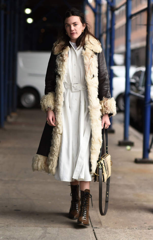 Более теплый и комфортный вариант - дубленка и массивные ботинки на шнуровке. Выбирайте обувь средней длины, чтобы она не резала ногу и обязательно надевайте колготки - в новом сезоне дизайнеры представили множество вариантов на любой вкус. Подбирайте их под цвет обуви, чтобы визуально удлинить ногу, или же выбирайте яркого цвета с принтом, чтобы разбавить образ.