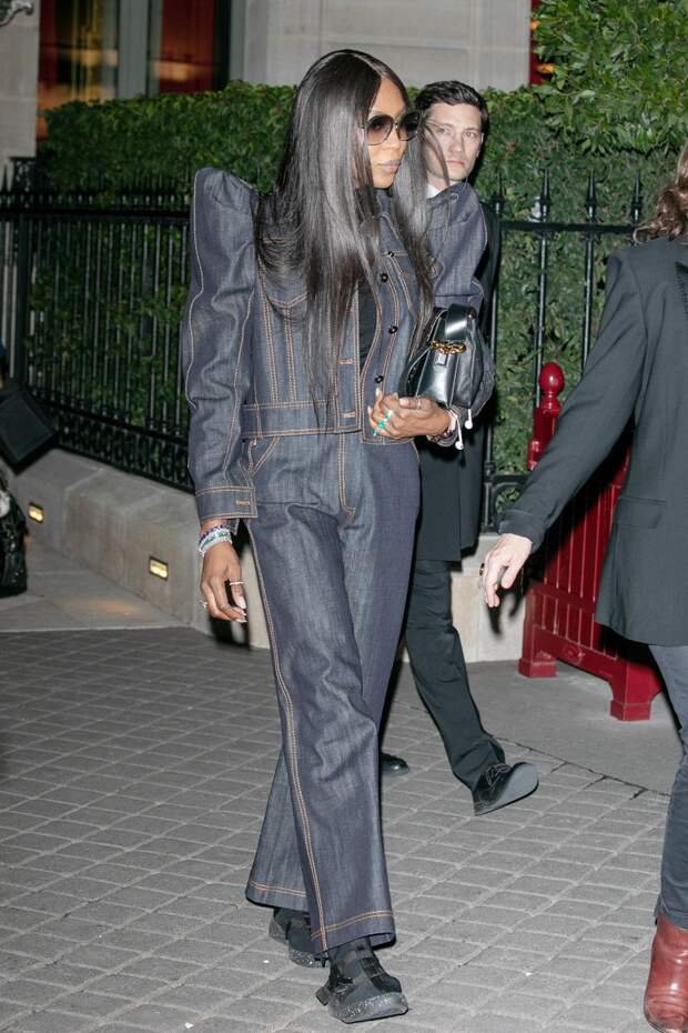 Пока Селин Дион временно взяла паузу в своих эксцентричных образах, ее эстафету приняла Наоми Кэмпбелл. Что ни день, то супермодель удивляет нас своими смелыми выходами, необычными цветовыми сочетаниями и вещами с эффектным кроем. Так, вчера 48-летнюю Наоми заметили на улицах вечернего Парижа, по которому она спешила в жакете их денима с острыми плечами (этот силуэт Жан-Поль Готье тонко окрестил "акульими плавниками") и прямых джинсах с высокой посадкой.