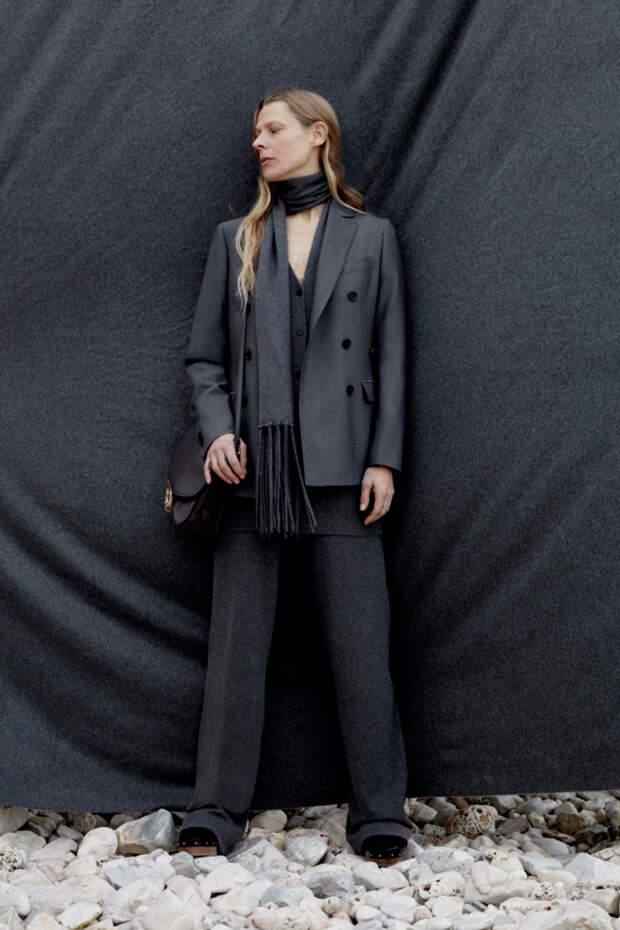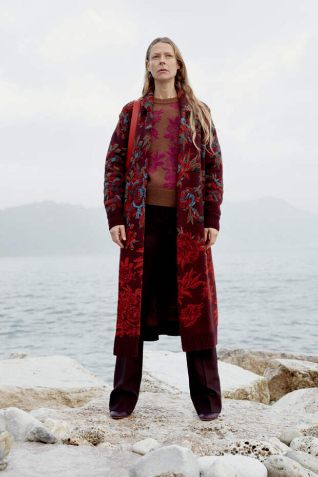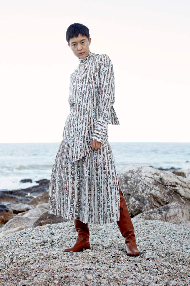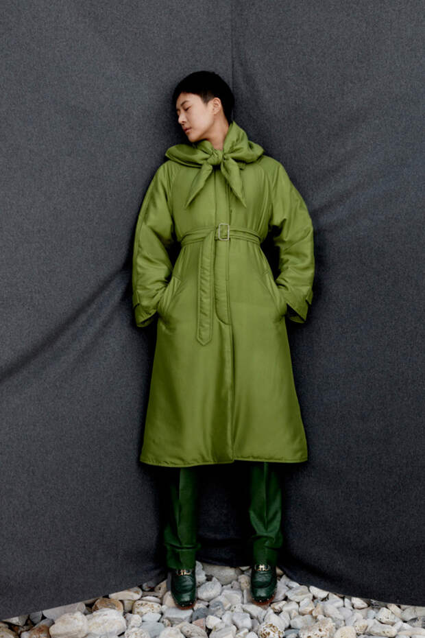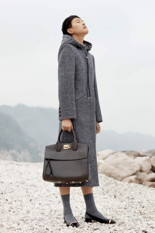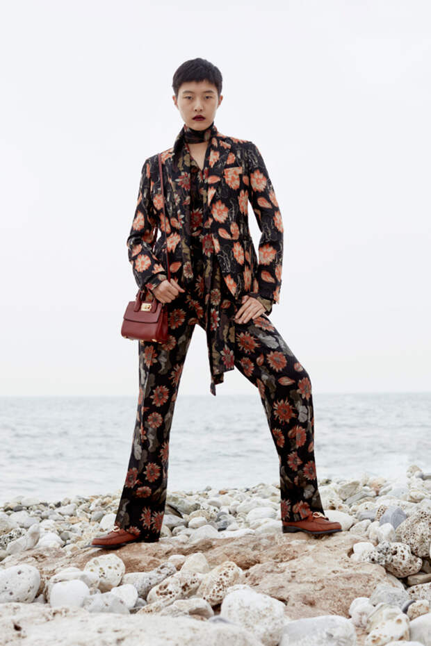В лукбуке Pre-Fall - 2019, фоном в котором служит холодный и пустой пейзаж, безупречность каждой детали и продуманность образов видны отчетливо. Здесь и многослойный серый комплект из шелкового бомбера и шерстяной юбки, дополненный короткими носками и остроносыми мужскими туфлями, и "бабушкины" свитеры со свободными брюками, и платья с принтом в виде садовых цветов, и пушистые шубы, и пуховик цвета матчи.