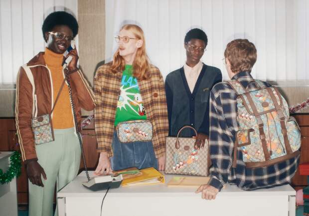 Все только и ждут, что окончания рабочего дня и начала главной вечеринки года. Декор офиса и подарки подготовлены, а главное — надеты лучшие наряды, которые уже пару месяцев ждали своего звездного часа. Туфли с глиттером, рубашки с геометричными принтами, брюки-клеш и "плечистые" жакеты — все лучшее сразу! Как только часы пробьют 17:00, скучный офис превратится в танцпол, а работники компании — в шумную веселую толпу, готовую танцевать до самого утра, смеяться и дарить друг другу подарки. Как геройский плащ превращает Кларка Кента в Супермена, так и образы Gucci раскрывают личность каждого героя кампании. Праздничную рекламу для Gucci сняли фотограф Марк Пекмезян и режиссер Акинола Дэвис. И после ее просмотра у вас гарантированно появится праздничное настроение!
