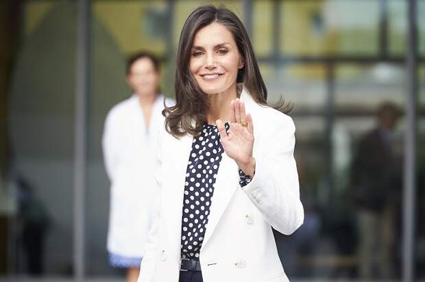Чаще всего королева Летиция появляется на публике в элегантных платьях и на каблуках, однако в этот раз монаршая особа слегка изменила привычному стилю, выбрав для нового выхода абсолютно базовый, максимально комфортный наряд. Узкие темно-синие брюки, блузка в горох, удлиненный белоснежный блейзер и лоферы из мягкой кожи - такой лук легко будет повторить каждой девушке, а главное, он подойдет для любого сценария.