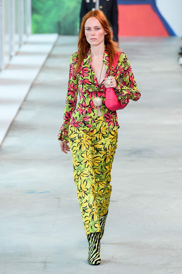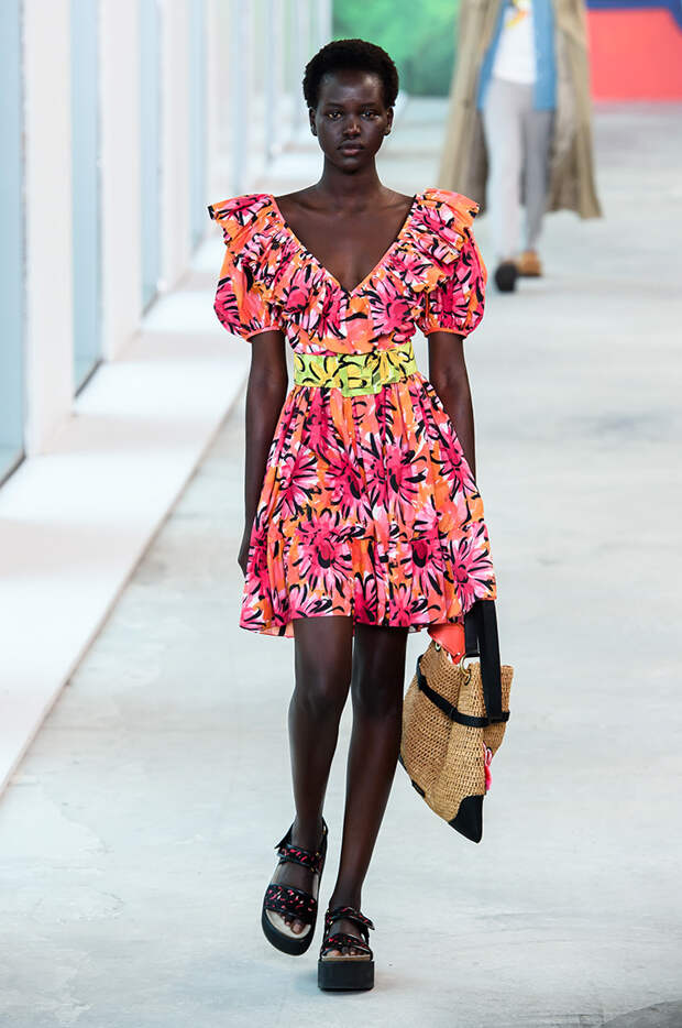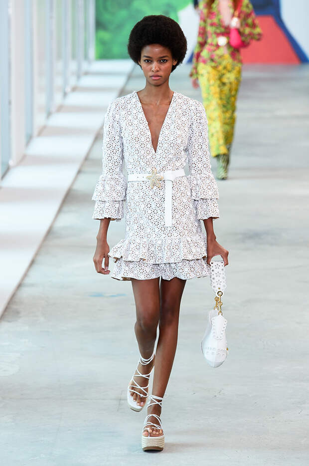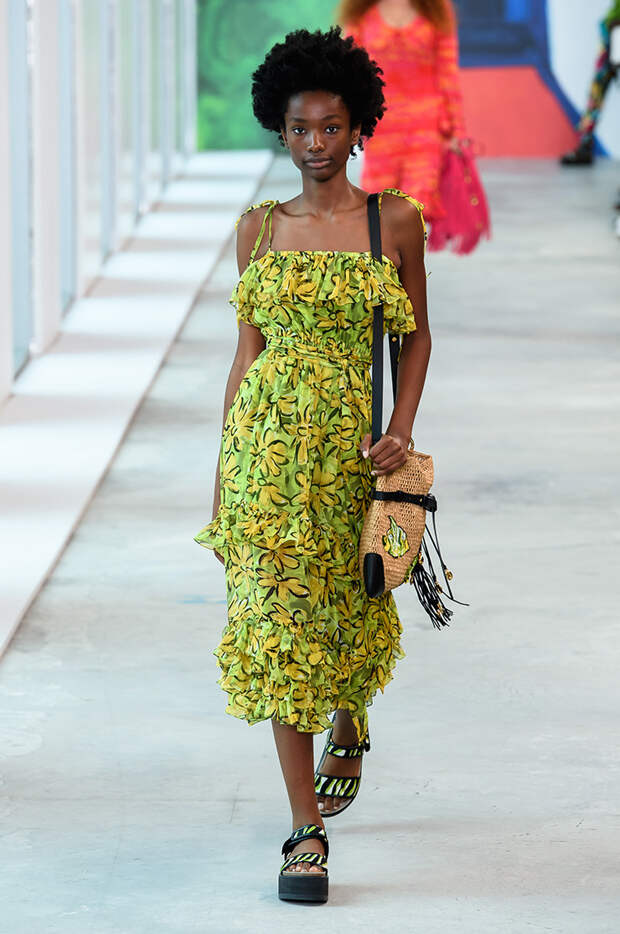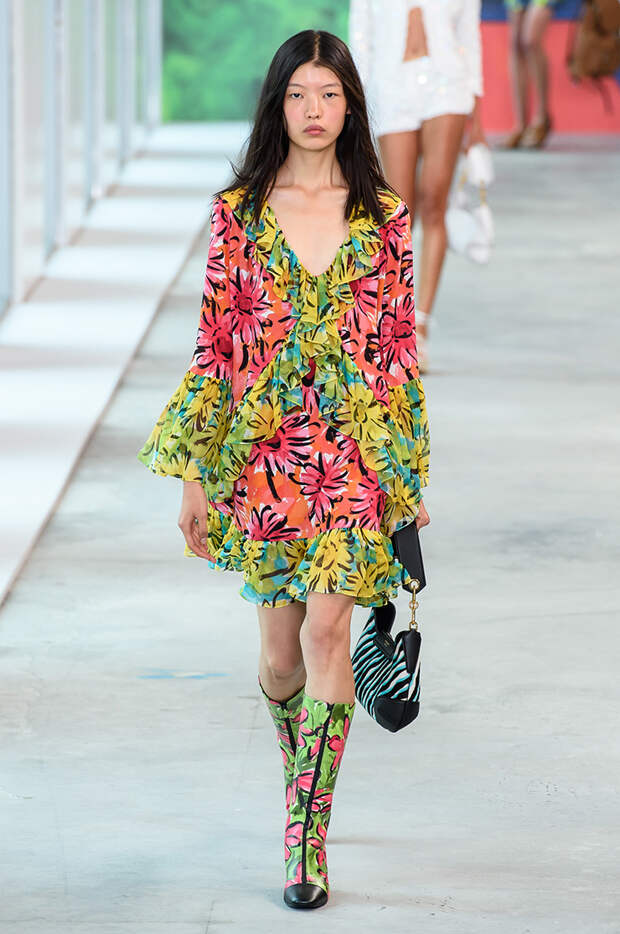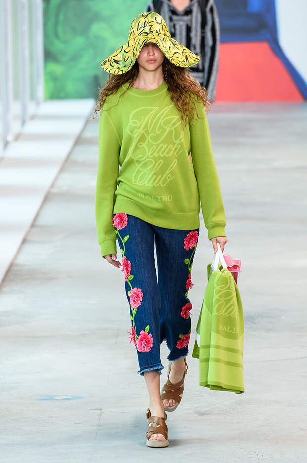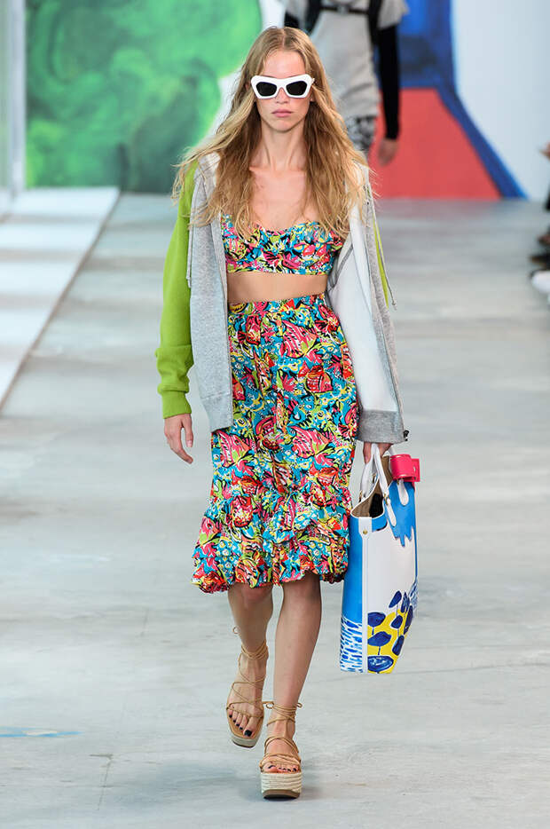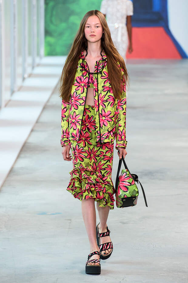 Как и красноречивый вид из панорамных окон на пирс с пришвартованными кораблями.Показ прошел в пространстве, украшенном картинами современной художницы Кристины Зимпель. На подиуме появлялись девушки, облаченные в пышные юбки и свободные рубашки, разрисованные цветами словно от руки, широкополые цветные шляпы и соблазнительные топы с теми же рисунками идеально подойдут девушкам, желающим будущим летом громко заявить о себе и не потеряться в толпе. А для любительниц пляжного отдыха здесь есть купальники, туники, соломенные сумки, солнечные очки и... плавательные резиновые шапочки. В первом блоке коллекции преобладают салатовый, оранжевый, ярко-розовый цвета. И, конечно, снова желтый: определенно, он весной и летом 2019 года точно будет в тренде. Как и вязанные вещи, будто найденные в бабушкином комоде, но переделанные на современный лад. Такие же можно увидеть не только у Корса, но и у многих других дизайнеров, показавших свои творения на Неделе. Во втором блоке коллекции Майкла — сексуальные наряды в лучших традициях бренда. Черные летящие платья и юбки с провокационными разрезами легко составляв конкуренцию вечерним одеяниям от Carolina Errera и Oscar De La Renta, которые мы успели оценить ранее.