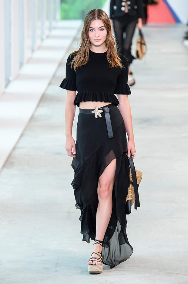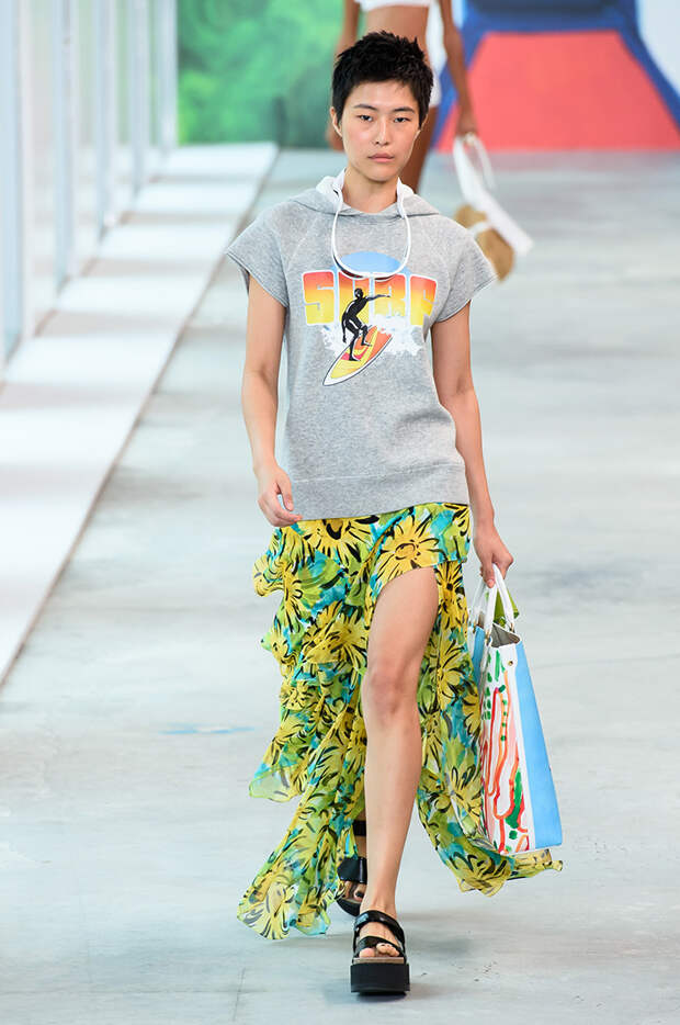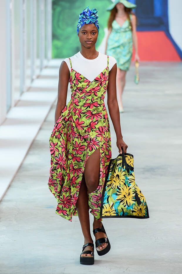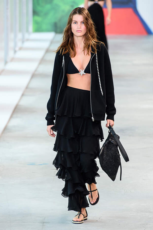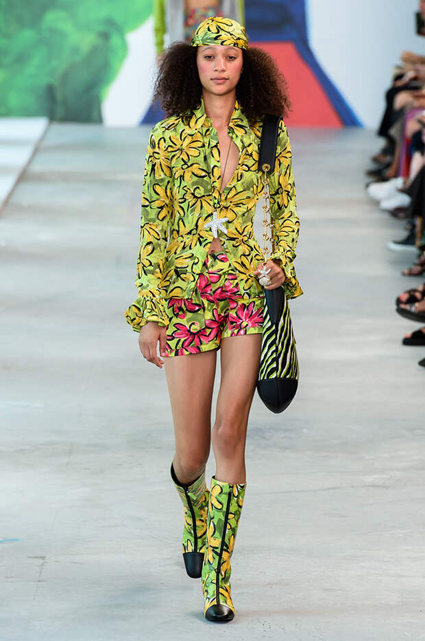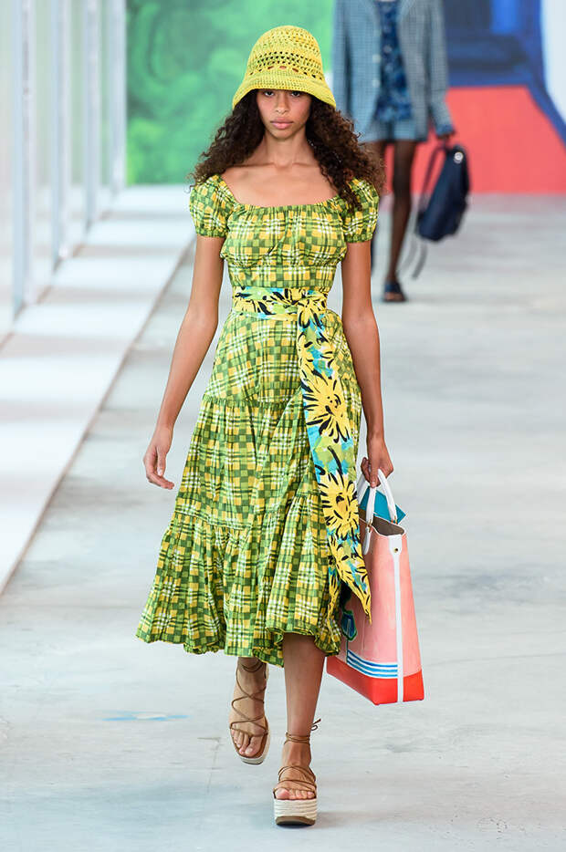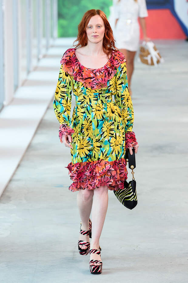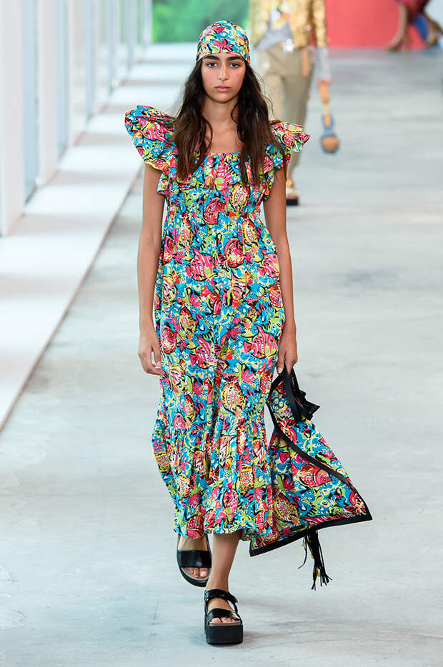Как и красноречивый вид из панорамных окон на пирс с пришвартованными кораблями.Показ прошел в пространстве, украшенном картинами современной художницы Кристины Зимпель. На подиуме появлялись девушки, облаченные в пышные юбки и свободные рубашки, разрисованные цветами словно от руки, широкополые цветные шляпы и соблазнительные топы с теми же рисунками идеально подойдут девушкам, желающим будущим летом громко заявить о себе и не потеряться в толпе. А для любительниц пляжного отдыха здесь есть купальники, туники, соломенные сумки, солнечные очки и... плавательные резиновые шапочки. В первом блоке коллекции преобладают салатовый, оранжевый, ярко-розовый цвета. И, конечно, снова желтый: определенно, он весной и летом 2019 года точно будет в тренде. Как и вязанные вещи, будто найденные в бабушкином комоде, но переделанные на современный лад. Такие же можно увидеть не только у Корса, но и у многих других дизайнеров, показавших свои творения на Неделе. Во втором блоке коллекции Майкла — сексуальные наряды в лучших традициях бренда. Черные летящие платья и юбки с провокационными разрезами легко составляв конкуренцию вечерним одеяниям от Carolina Errera и Oscar De La Renta, которые мы успели оценить ранее.