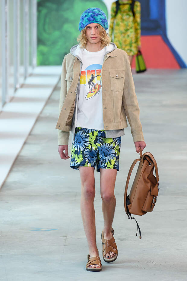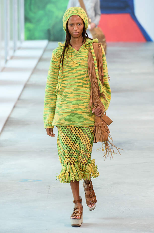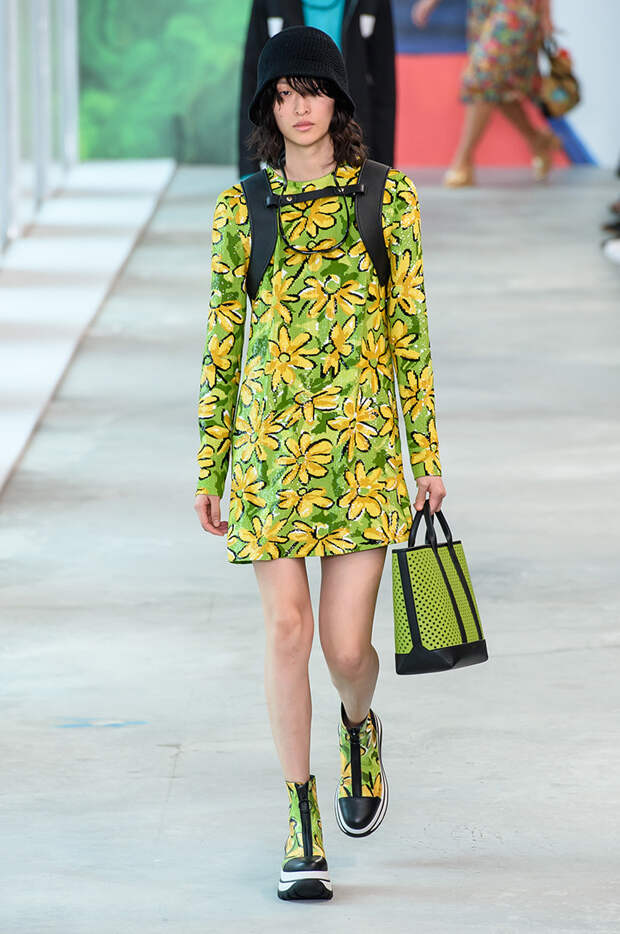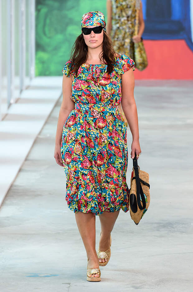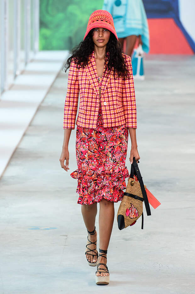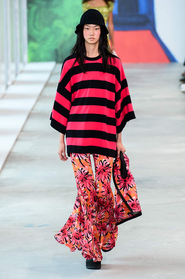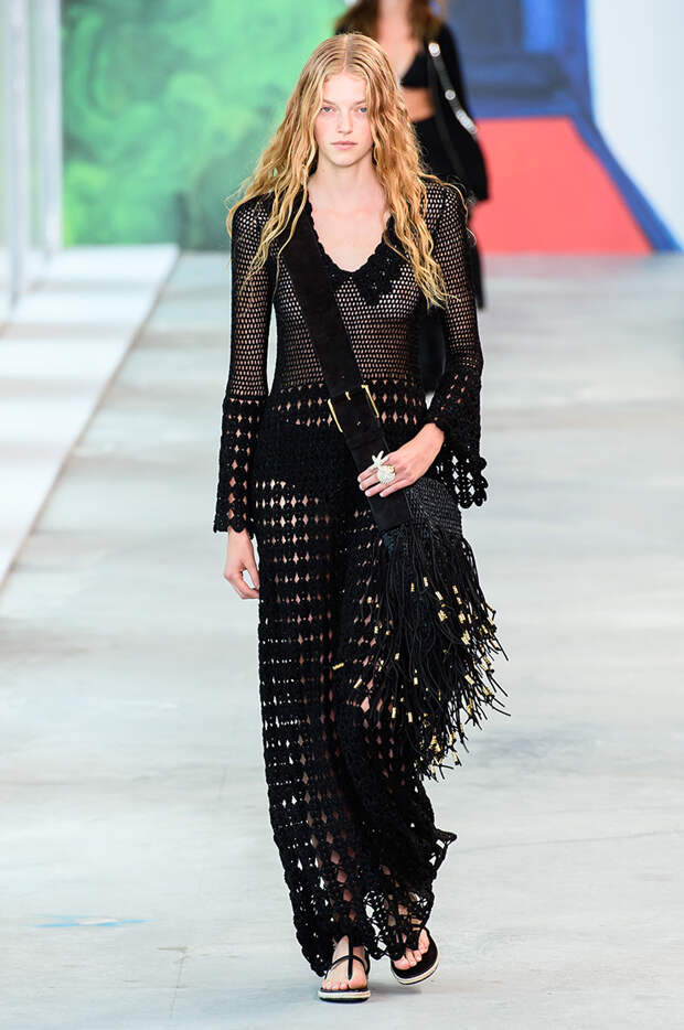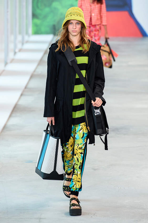 Как и красноречивый вид из панорамных окон на пирс с пришвартованными кораблями.Показ прошел в пространстве, украшенном картинами современной художницы Кристины Зимпель. На подиуме появлялись девушки, облаченные в пышные юбки и свободные рубашки, разрисованные цветами словно от руки, широкополые цветные шляпы и соблазнительные топы с теми же рисунками идеально подойдут девушкам, желающим будущим летом громко заявить о себе и не потеряться в толпе. А для любительниц пляжного отдыха здесь есть купальники, туники, соломенные сумки, солнечные очки и... плавательные резиновые шапочки. В первом блоке коллекции преобладают салатовый, оранжевый, ярко-розовый цвета. И, конечно, снова желтый: определенно, он весной и летом 2019 года точно будет в тренде. Как и вязанные вещи, будто найденные в бабушкином комоде, но переделанные на современный лад. Такие же можно увидеть не только у Корса, но и у многих других дизайнеров, показавших свои творения на Неделе. Во втором блоке коллекции Майкла — сексуальные наряды в лучших традициях бренда. Черные летящие платья и юбки с провокационными разрезами легко составляв конкуренцию вечерним одеяниям от Carolina Errera и Oscar De La Renta, которые мы успели оценить ранее.