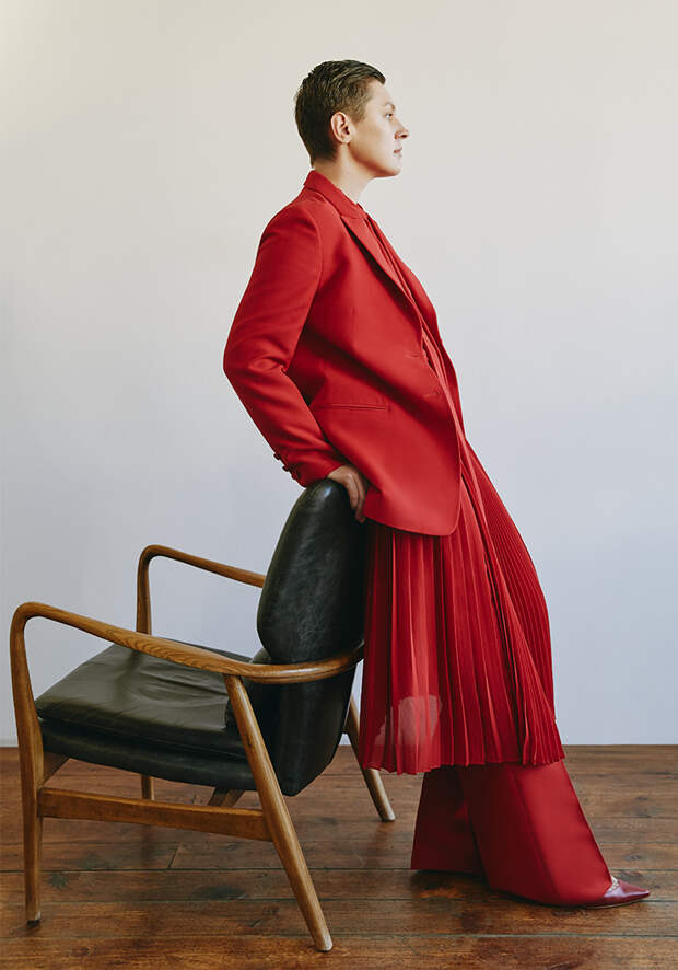 Жакет, платье и брюки, Valentino; туфли, Manolo Blahnik