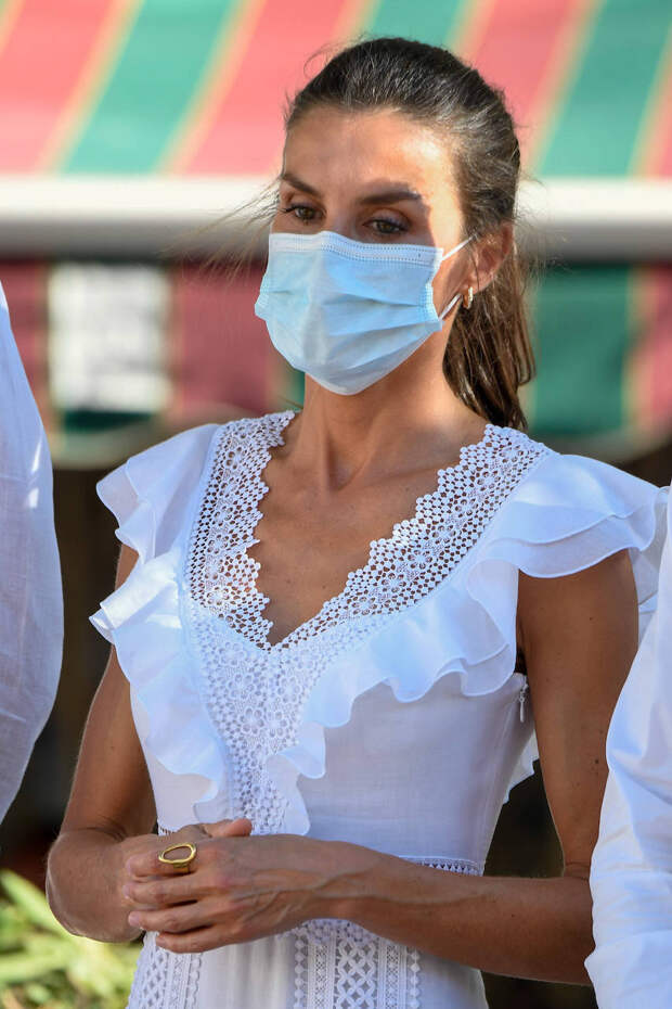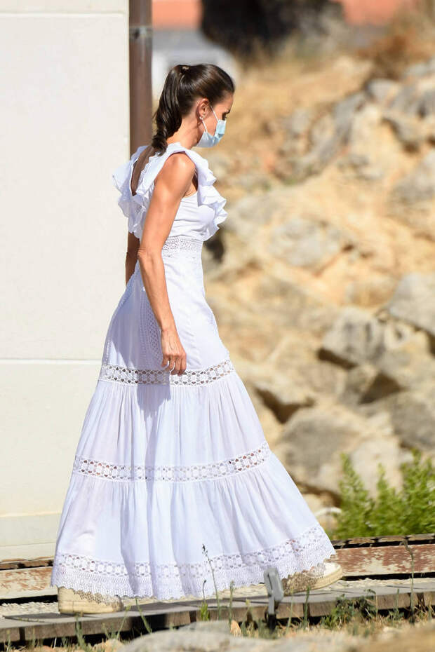 Королева Испании Летиция продемонстрировала аутфит в стиле бохо. Белое полупрозрачное платье в пол с рюшами, кружевными вставками и V-образным вырезом в зоне декольте позволило королеве создать легкий образ — идеальный для летнего отпуска.