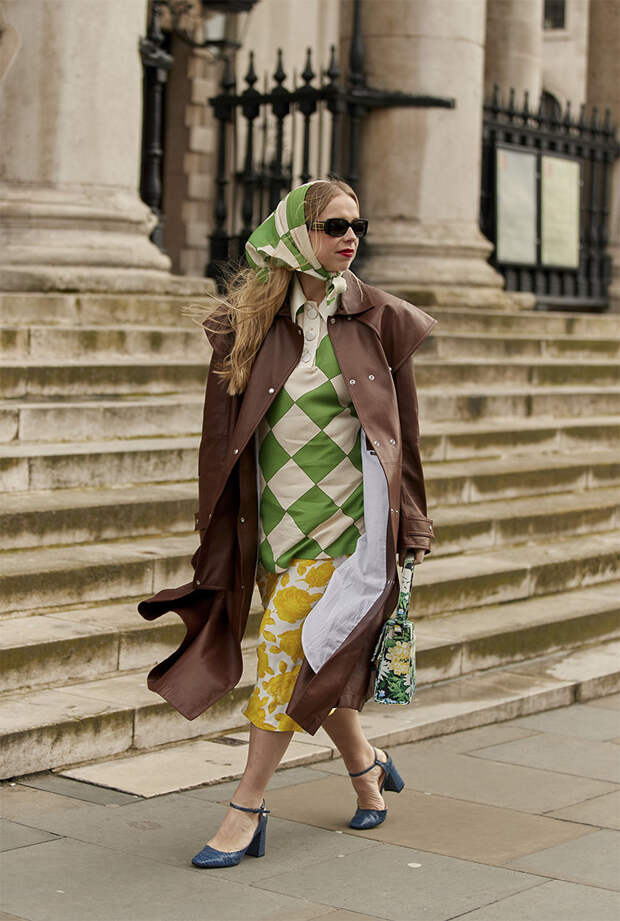 Для любителей контрастов тоже есть варианты. К примеру, носить коричневый в дуэте с синим или зеленым. С одним из самых простых сочетаний вы наверняка знакомы: кто не носил голубые джинсы на пару с кофейно-бежевым свитером? Если этот вариант кажется слишком простым, советуем вдохновиться идеями из нашей подборки. Надевайте лакированный бомбер синего цвета с коричневыми вельветовыми брюками. Дополняйте образ небесно-голубым клатчем – вуаля! В крайнем случае всегда выручает обувь: приправляйте базовый серо-бежевый аутфит ультрамодными «дутыми» туфлями травянистого оттенка – гениально не значит сложно.