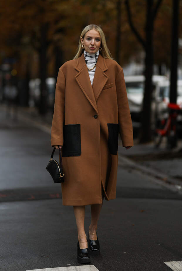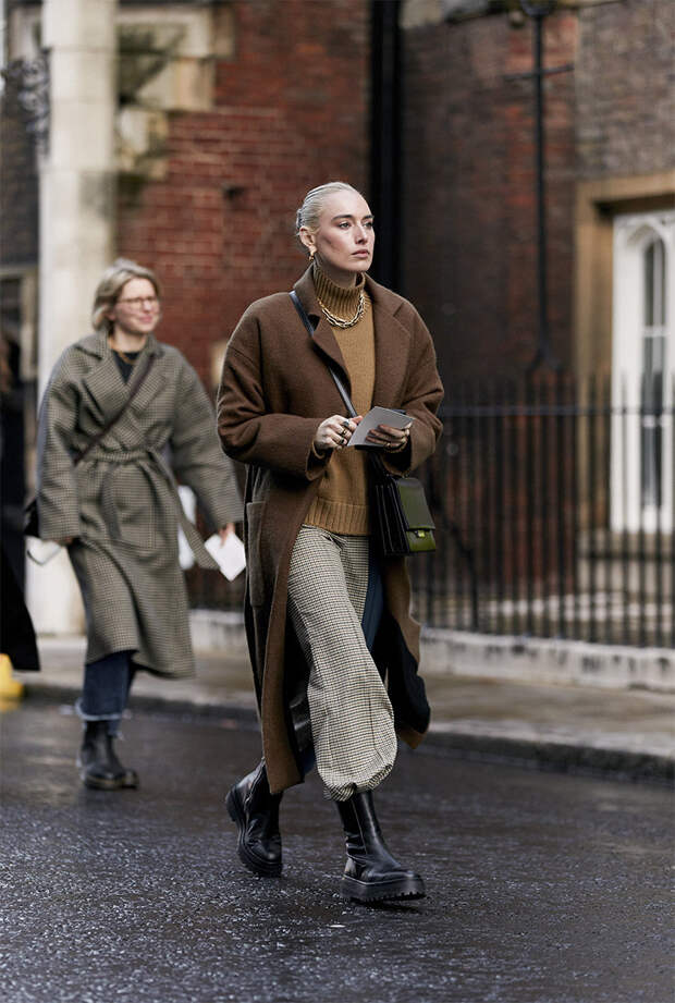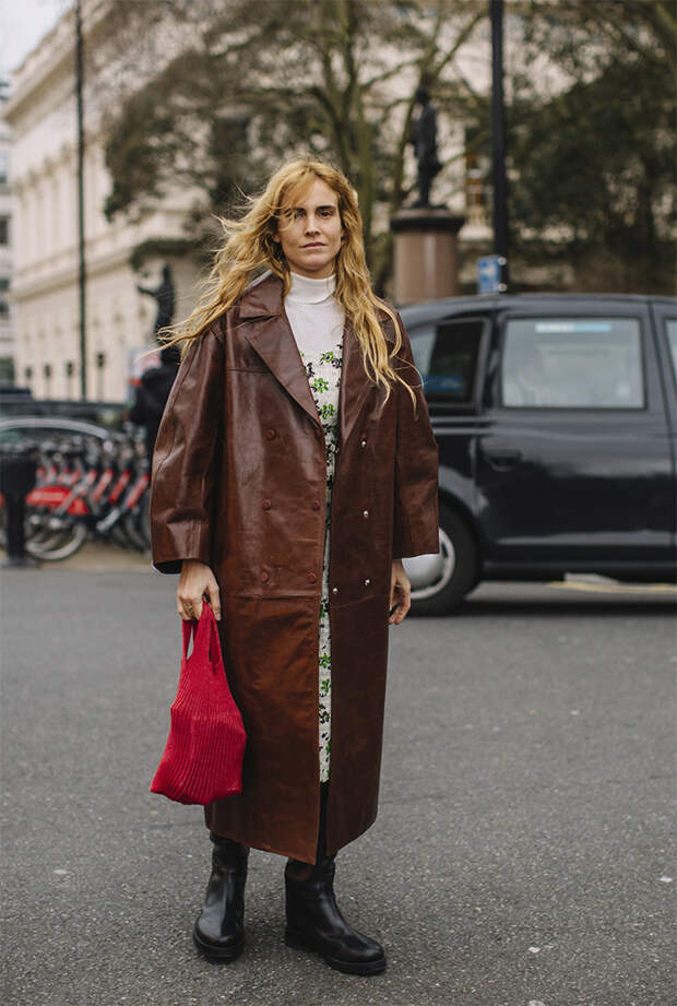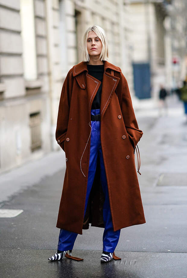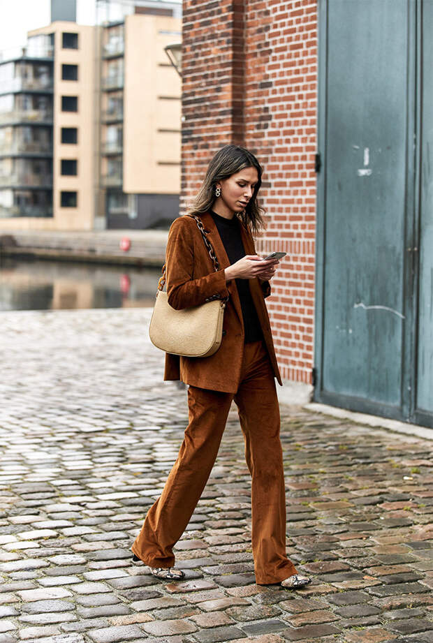 Во-вторых, вряд ли можно найти цвет, который будет выглядеть так же роскошно и «дорого» – в хорошем смысле слова. Сочетать коричневый героини стритстайла предлагают по-разному, ведь вариаций действительно много. Один из самых базовых вариантов – носить коричневый со схожими оттенками. Вы правильно поняли: берем на вооружение всю бежево-коричневую гамму и не забываем про оранжевый – он прекрасно дополняет монотонные луки. Посмотрите, как это делают модницы: носят пальто шоколадного оттенка с морковными брюками из эко-кожи и базовой бежевой сумкой. Еще один вариант – завоевывать внимание деталями. Смело дополняйте монохромный бежевый образ ярким апельсиновым ридикюлем или такого же цвета шляпой – яркость всегда в моде.