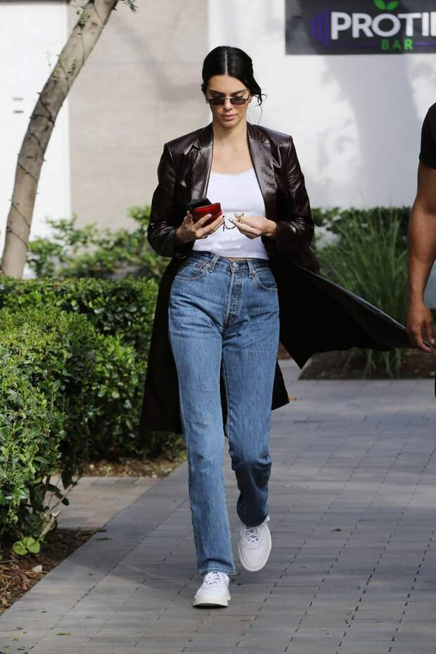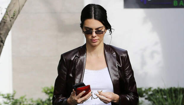 Если Белла Хадид еще предпочитает гулять в пуховике, Кендалл Дженнер уже отправляется за покупками налегке: модель сменила шерстяные пальто и теплые куртки на кожаный тренч в насыщенном оттенке темного шоколада. Свой плащ Кендалл предпочитает носить нараспашку в духе героев "Матрицы" — хорошо, что мягкий калифорнийский климат это позволяет — в паре с лаконичным белым топом и джинсами с высокой посадкой.