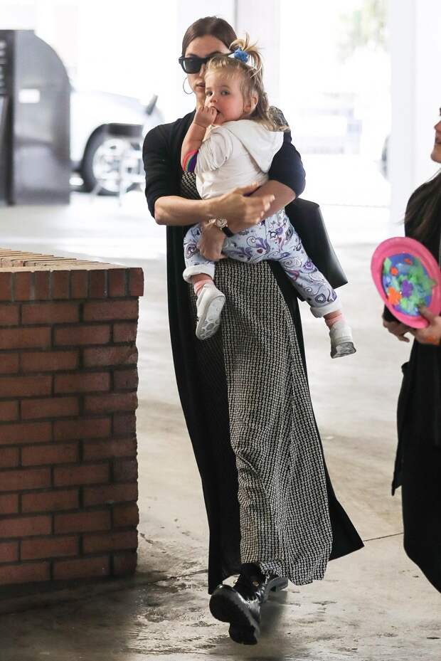 На прогулку с дочерью россиянка отправилась в макси-платье с пестрым орнаментом, длинном черном кардигане и ботинках на тракторной подошве — жаль, Брэдли не смог составить компанию своим девочкам.