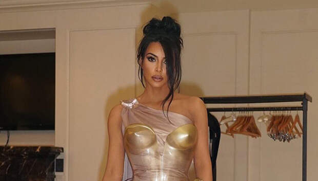 За вечер она сменила два образа. Первый скорее напоминал одеяние греческой богини - драпированное платье с форменным золотистым корсетом из пластика, повторяющим изгибы тела. А второе - футуристичное рельефное платье с "ракушками". Ким, не останавливайся, мы хотим еще винтажного кутюра!