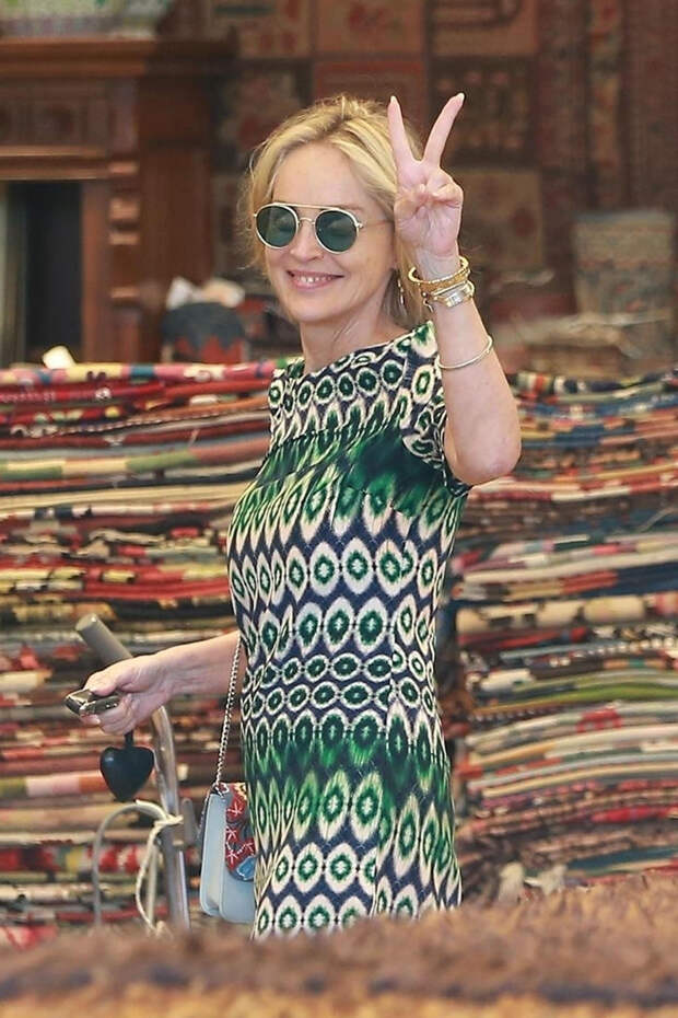 Оптимизму и обаянию Шэрон Стоун можно только позавидовать: судя по фото папарацци, актриса всегда в отличном расположении духа, а ее фигура в 61 год вызывает восхищение и, опять же, белую зависть. Только посмотрите, как к лицу звезде "Основного инстинкта" это мини-платье из штапеля с пестрым орнаментом — в нем наша героиня отправилась на шопинг с друзьями в Западном Голливуде.
