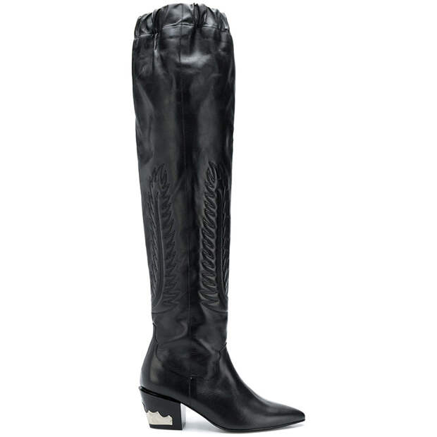 Неожиданно популярные ботфорты-колготки с острым носом сдали позиции: им на смену приходят сапоги с широким голенищем. Фасон идеально сочетается с другим осенним трендом — ковбойским стилем. Их, к примеру, соединили Toga Pulla и Chloé. Высота каблука не принципиальна: Gianvito Rossi представить без шпилек сложно, но комфортные модели можно найти у Jimmy Choo и Casadei.