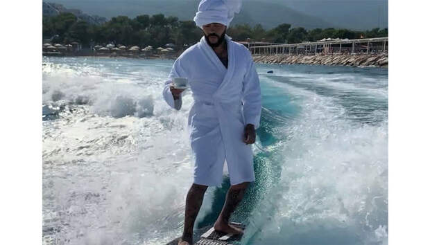 Из чего состоят ваши утренние ритуалы? Вот Тимати, к примеру, любит начать день с кружки ароматного кофе. Правда, пить его он предпочитает не в постели, а балансируя на доске для серфинга посреди бушующих волн. Прямо сейчас музыкант гостит в Турции, откуда и шлет нам свой впечатляющий видеопривет. В коротком ролике, который появился на странице основателя лейбла Black Star, Тимати в белоснежном халате и полотенце, завязанном тюрбаном на голове, лихо седлает волну и умудряется чинно держать кружку и блюдце, да еще и периодически отхлебывает кофе.