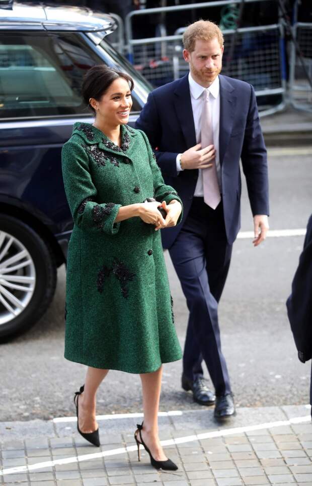 Сегодняшнее торжественное мероприятие посвящено канадцам, которые живут в Великобритании — к слову, Маркл и сама прожила в Торонто около шести дет и не раз признавалась, что считает эту страну своим вторым домом.Меган появилась перед собравшимися в пальто Erdem глубокого изумрудного оттенка с объемной цветочной вышивкой, расшитой стеклярусом: верхнюю одежду специально подогнали под фигуру будущей мамы. А еще наша героиня так и не смогла отказаться от обуви на каблуках и вышла в свет в туфлях на высокой шпильке с бантами — не страшно, всегда можно опереться при случае на любимого супруга.