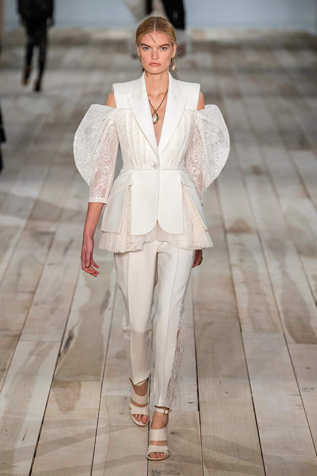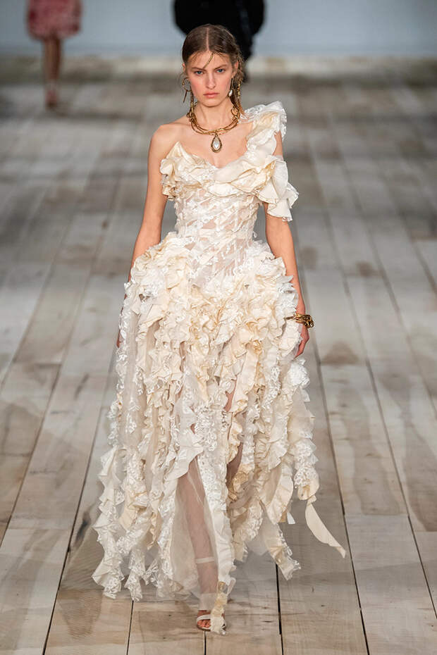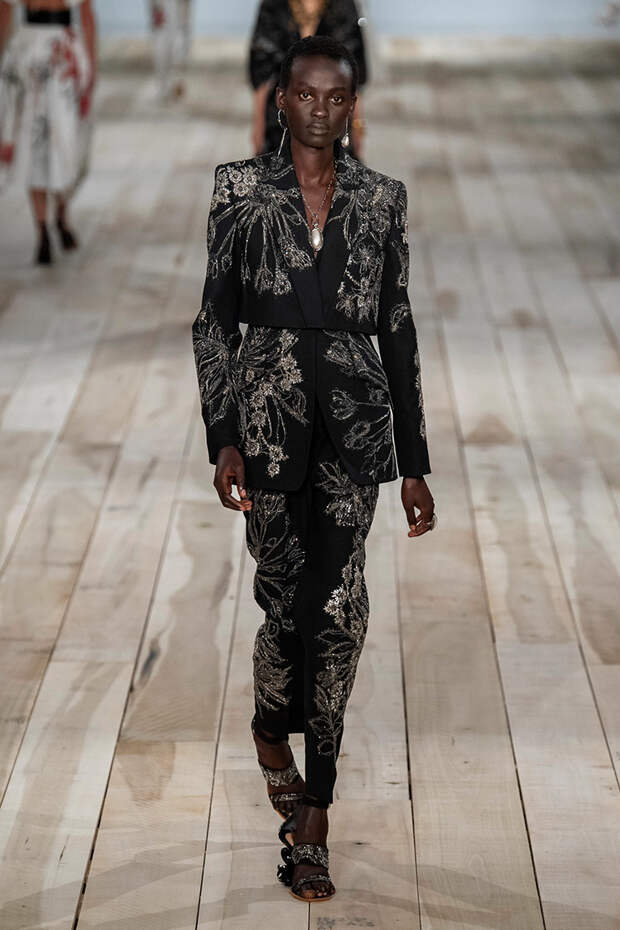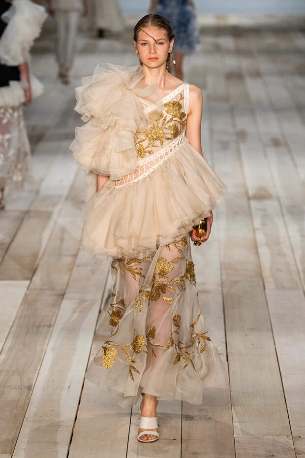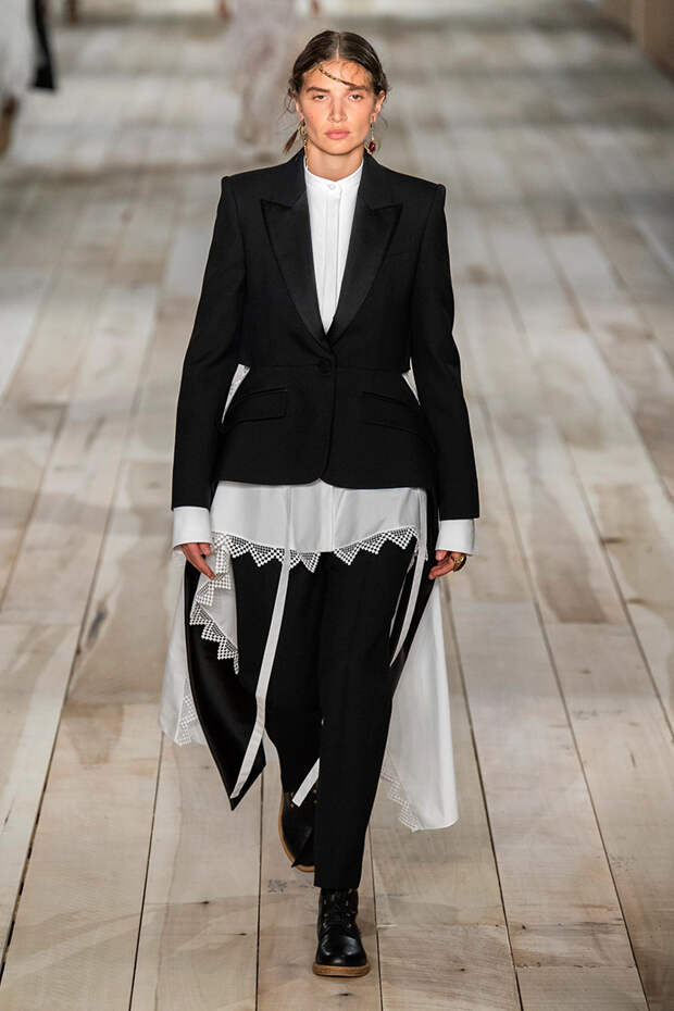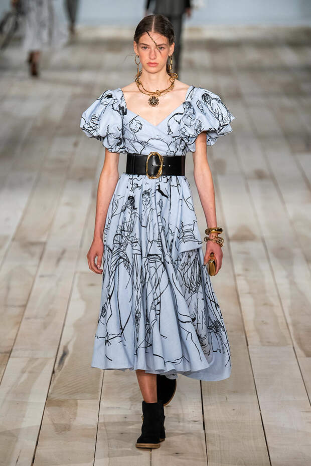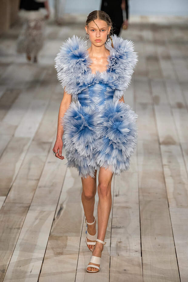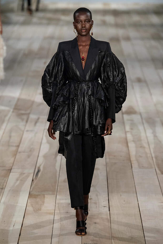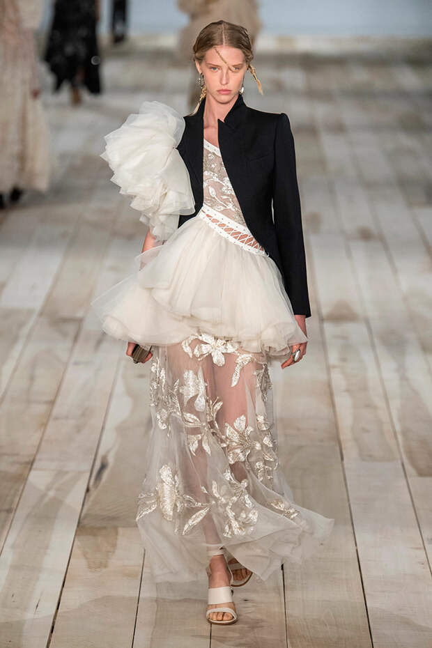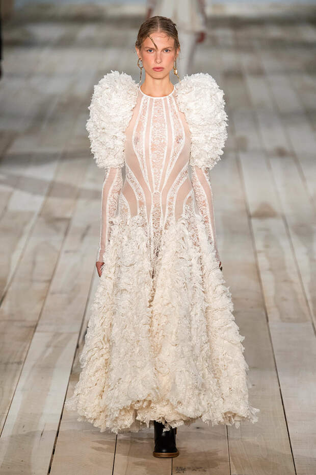 Объединяли их обязательные отсылки к историческому костюму, пышные рукава, использование ручных прикладных техник, относительная закрытость и обильное использование декоративных элементов: от кружева до оборок. И это как минимум.Но если сама одежда была просто красивой, в общем не концептуальной, (Саре Бертон не повезло — в сравнении с самим Александром Маккуином концептуалистом в принципе останется мало кто) то у всего показа концепт был — и чтобы удержаться на заданной линии, Бертон не могла в принципе сказать ничего другого. "Мне нравится идея того, что люди проводят время вместе, чтобы создать что-то общее. Это время не только для работы, но и для встреч, разговоров, в целом единения с миром". Воссоздать такую ситуацию дизайнер решила прямо на подиуме. И на поклон вышла со всей командой, работавшей на коллекцией — в окружении тех людей, которые в мире моды обычно остаются невидимыми. Как минимум то же самое на последней неделе высокой моды совсем недавно делал Пьерпаоло Пиччоли с коллегами из Valentino. Но жест все равно красивый — заставляет поверить в человечность вечно суровой, холодной моды.