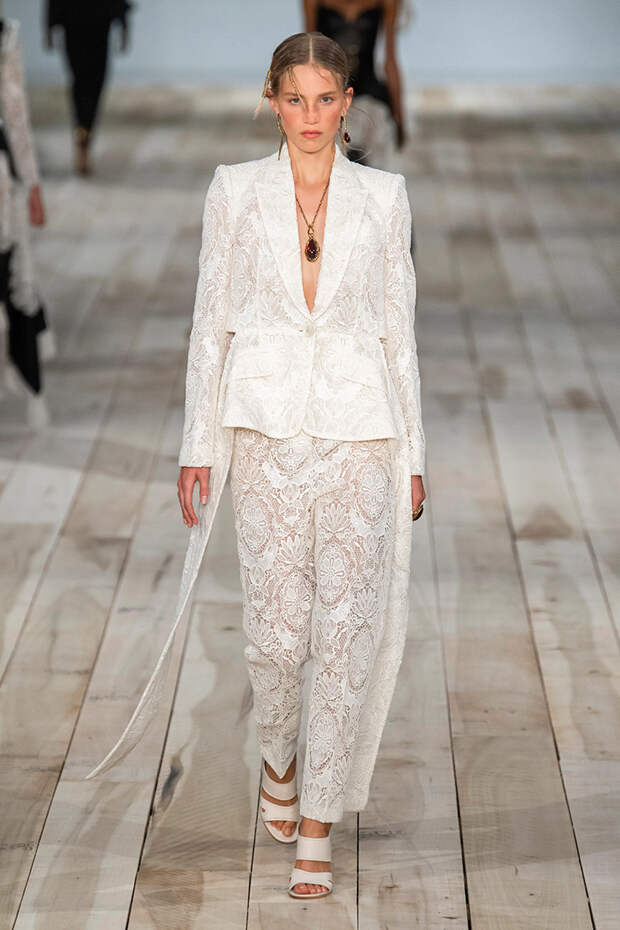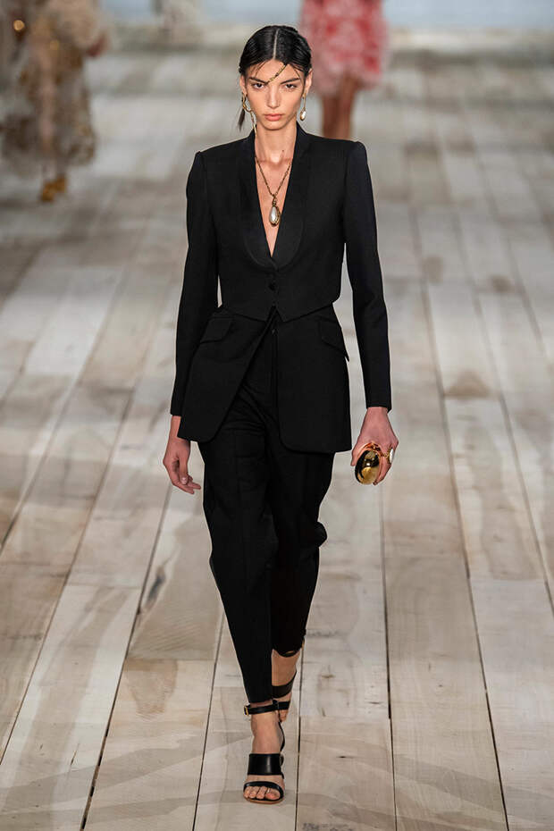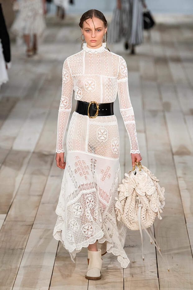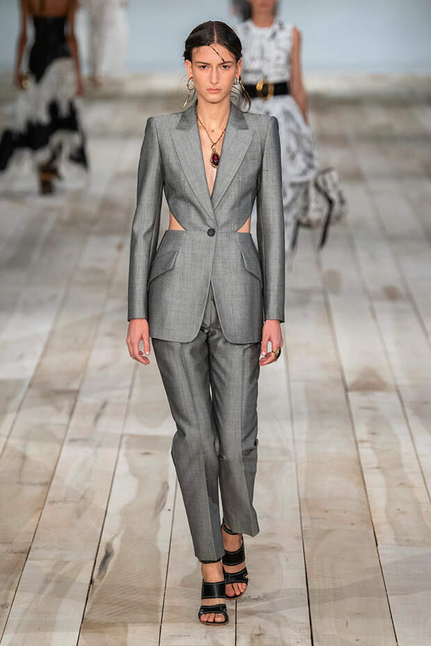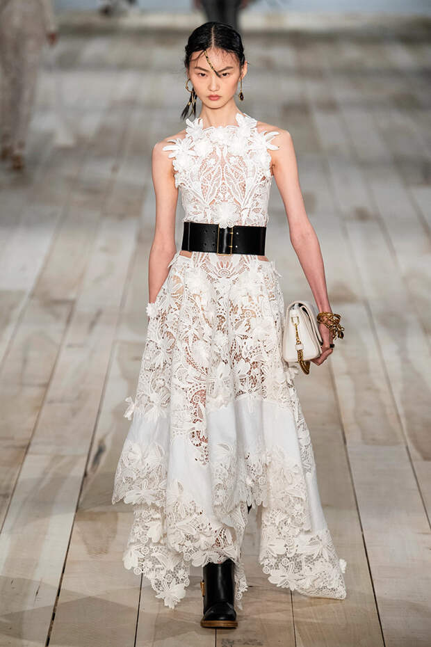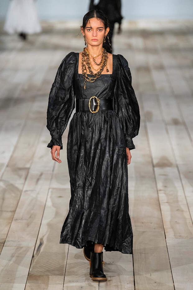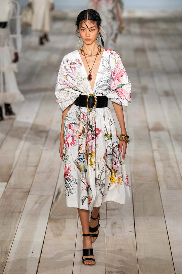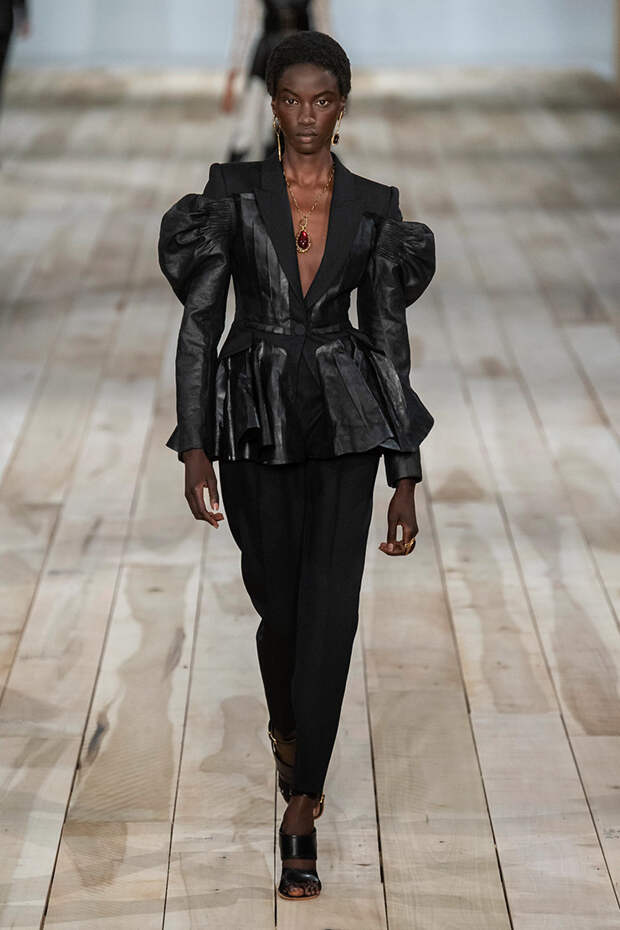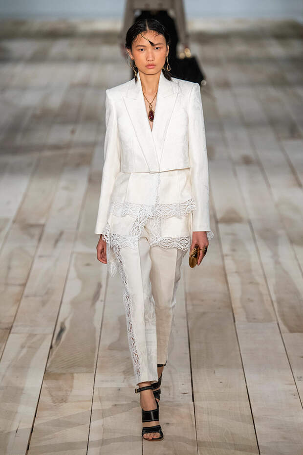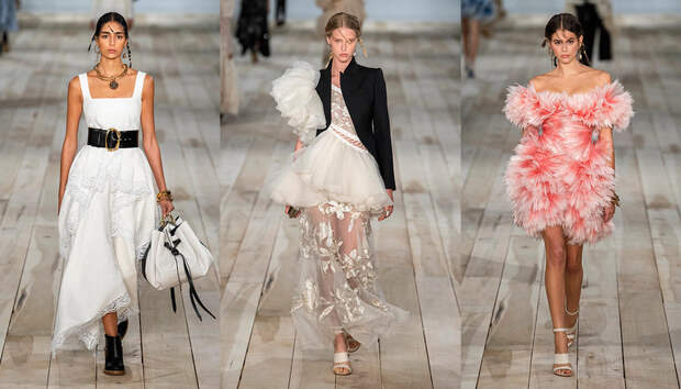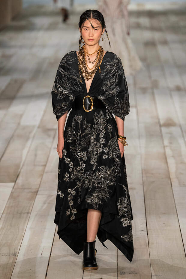 Объединяли их обязательные отсылки к историческому костюму, пышные рукава, использование ручных прикладных техник, относительная закрытость и обильное использование декоративных элементов: от кружева до оборок. И это как минимум.Но если сама одежда была просто красивой, в общем не концептуальной, (Саре Бертон не повезло — в сравнении с самим Александром Маккуином концептуалистом в принципе останется мало кто) то у всего показа концепт был — и чтобы удержаться на заданной линии, Бертон не могла в принципе сказать ничего другого. "Мне нравится идея того, что люди проводят время вместе, чтобы создать что-то общее. Это время не только для работы, но и для встреч, разговоров, в целом единения с миром". Воссоздать такую ситуацию дизайнер решила прямо на подиуме. И на поклон вышла со всей командой, работавшей на коллекцией — в окружении тех людей, которые в мире моды обычно остаются невидимыми. Как минимум то же самое на последней неделе высокой моды совсем недавно делал Пьерпаоло Пиччоли с коллегами из Valentino. Но жест все равно красивый — заставляет поверить в человечность вечно суровой, холодной моды.