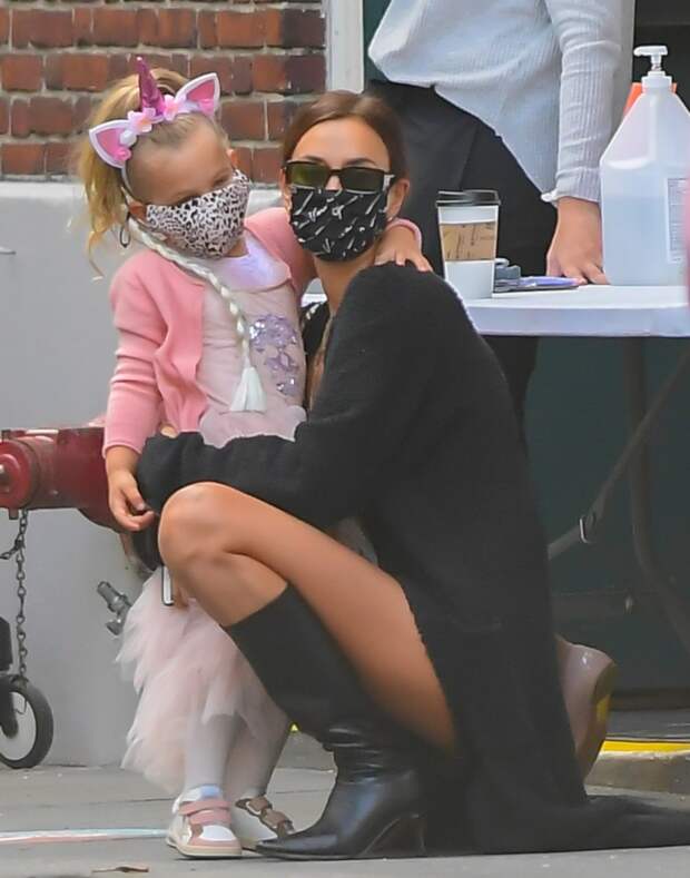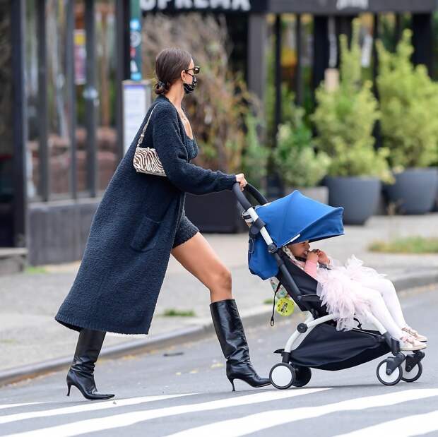 Нашей героине приглянулся ансамбль авторства бренда Ким Кардашьян SKIMS. Она надела вязаные трусы-кникерсы с высокой талией, которые стали абсолютным хитом модниц на время карантина. Ирина вряд ли соскучилась по режиму изоляции, но решила, что такой стильный образ достоин того, чтобы его увидел весь мир. Лаконичный топ и кардиган на плечах стали удачным завершением всего аутфита. В качестве обуви Шейк выбрала черные ботфорты с каблуком-рюмочкой. Модель вдумчиво подошла и к выбору аксессуаров: крошечная сумка под зембру и прямоугольные солнцезащитные очки расставили недостающие акценты. Зато малышка Лея нарядилась как балерина - во все розовое и воздушное.