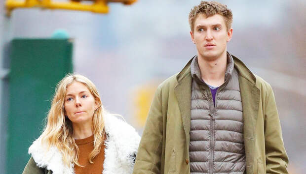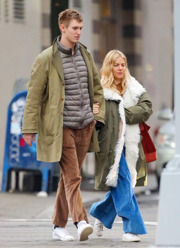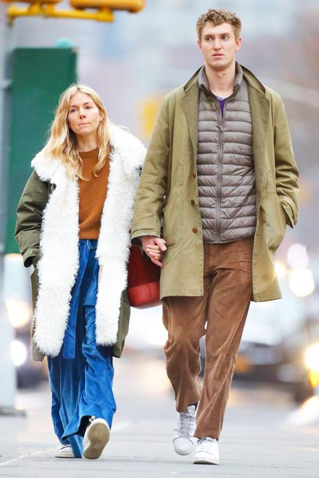 Сиенна закуталась в уютную парку с пушистым белым мехом и дополнила расслабленный образ широкими джинсами с нарочито длинным ремнем, коричнево-рыжим джемпером и светлыми кедами, а ее спутник выбрал вещи в похожей природно-натуральной гамме — колоритная и невероятно гармоничная пара!