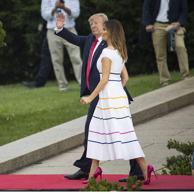 Для выхода первая леди предпочла белоснежное платье в радужных горизонтальных полосках - с пышной юбкой миди и бантом на правом плече. А дополнили образ лакированные лодочки ягодного оттенка на головокружительной шпильке.